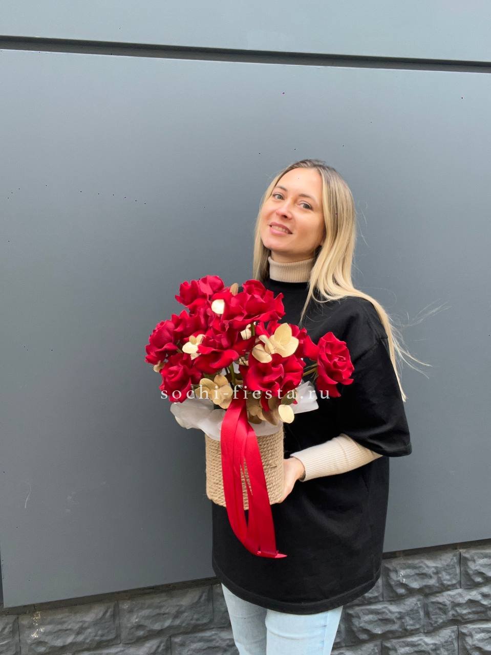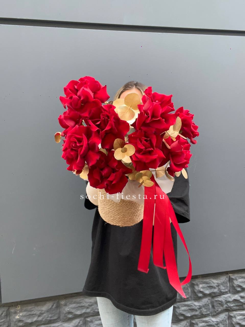 Двадцать одна роза глубокого красного оттенка собрана в плотную композицию с бордовым амарантом и натуральными сухоцветами. Насыщенность цвета создает выразительный образ, а округлая коробка сохраняет форму и свежесть бутонов надолго.