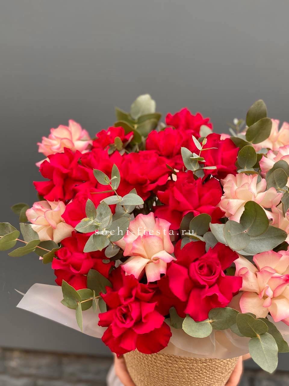 Двадцать пять вывернутых французских роз образуют плотную полусферу насыщенного оттенка. Натуральное джутовое кашпо добавляет композиции природной простоты и завершённости.