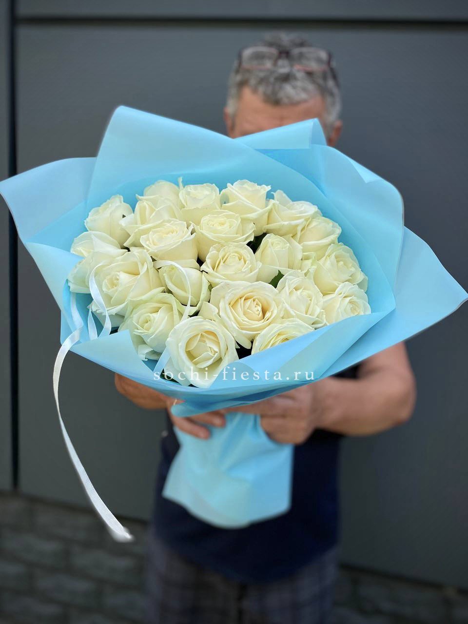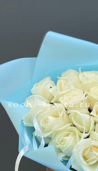 Тридцать пять белых роз образуют объемную композицию с выразительным силуэтом. Светлая упаковка поддерживает воздушность и графичность линий.