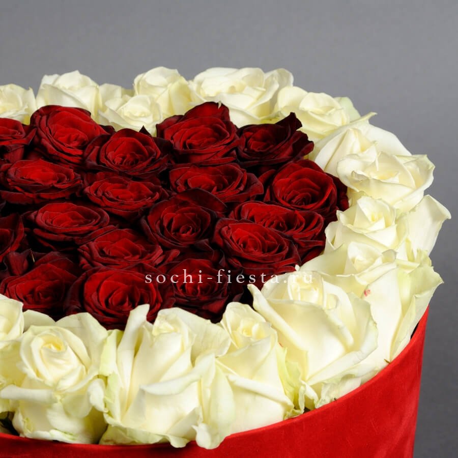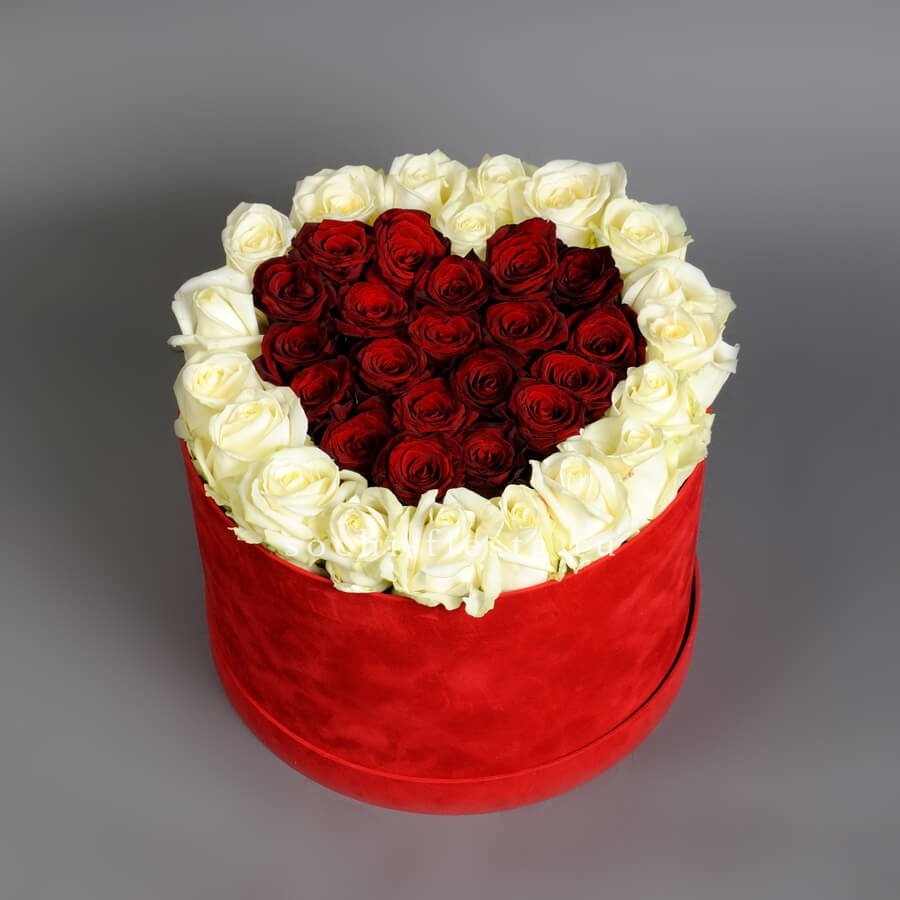 Тридцать девять роз в цилиндре выстраиваются в чёткую геометрию красного и белого. Плотная сборка на оазисе держит форму и создаёт графичное цветовое решение.