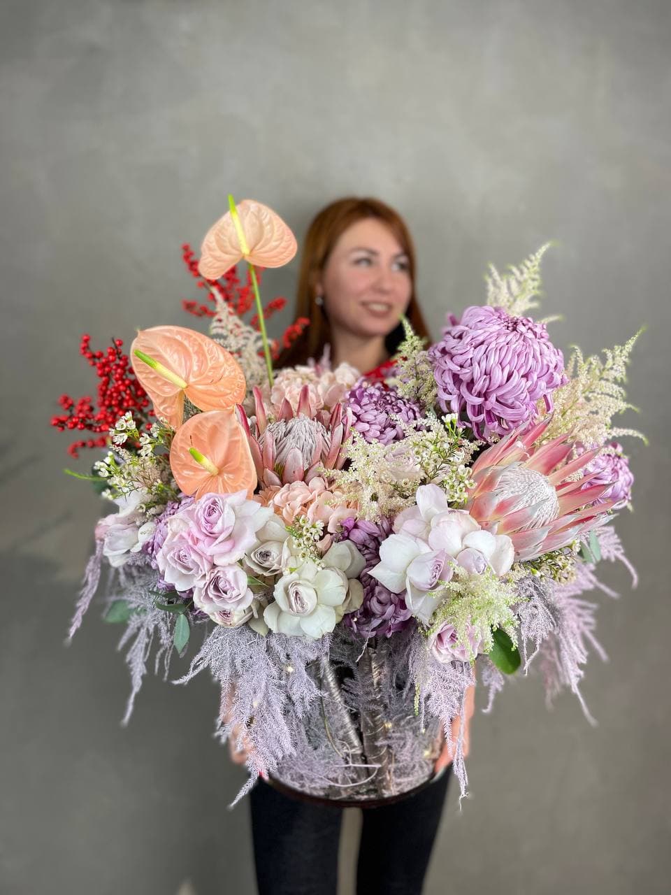 Крупные соцветия гортензии и экзотичные протеи создают плотную текстуру с глубокими переходами оттенков. Антуриумы и пионовидные розы добавляют объёма, а веточки илекса и хамелациума разбивают композицию лёгкими штрихами зелени.