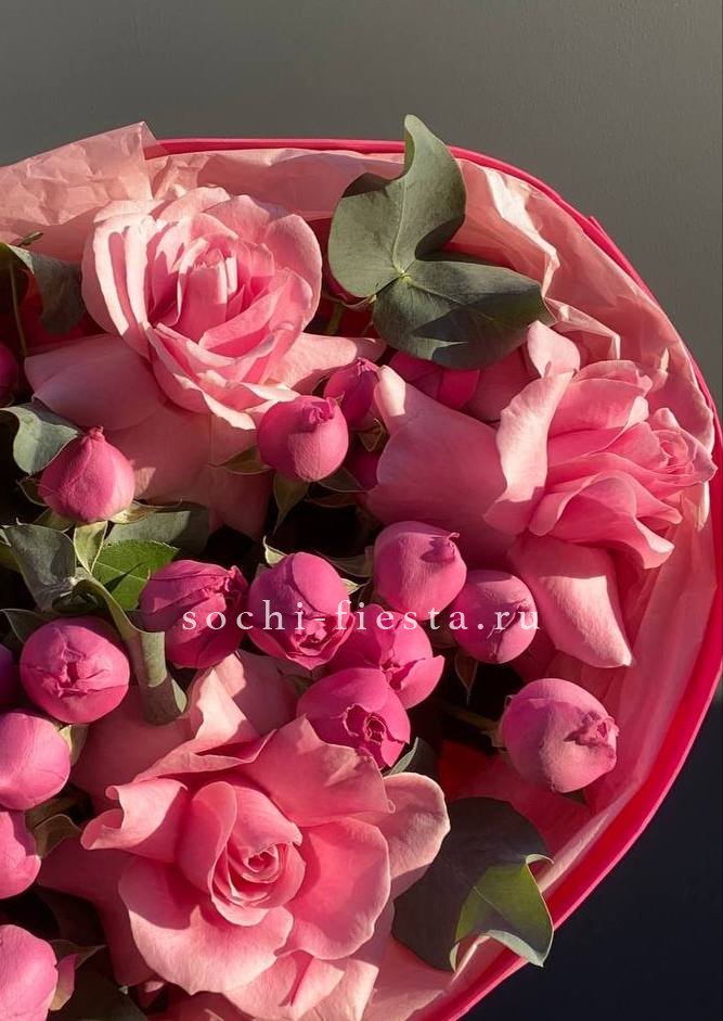 Пышная композиция в розовой гамме с плотными шапками гортензии и многоярусными бутонами эустомы. Кустовые розы добавляют объём, а эвкалипт создаёт воздушную раму вокруг центральных цветов. Авторская упаковка с тишью завершает образ.