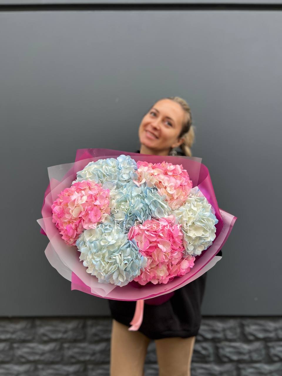 Семь соцветий гортензии раскрываются воздушным облаком с мягкими переходами оттенков. Букет дарит ощущение лёгкости и свежести летнего сада в любое время года.