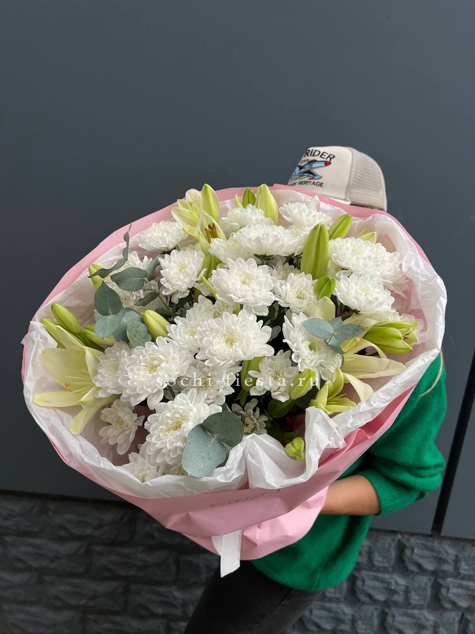 Погрузитесь в облако нежности и аромата! Этот восхитительный букет объединяет пышные шапки хризантем, изысканные бутоны лилий и свежий эвкалипт. Сочетание текстур и деликатных оттенков белого создает ощущение легкости и свежести. Это идеальный подарок для выражения самых светлых и теплых чувств, который растопит любое сердце и наполнит дом чудесным запахом.