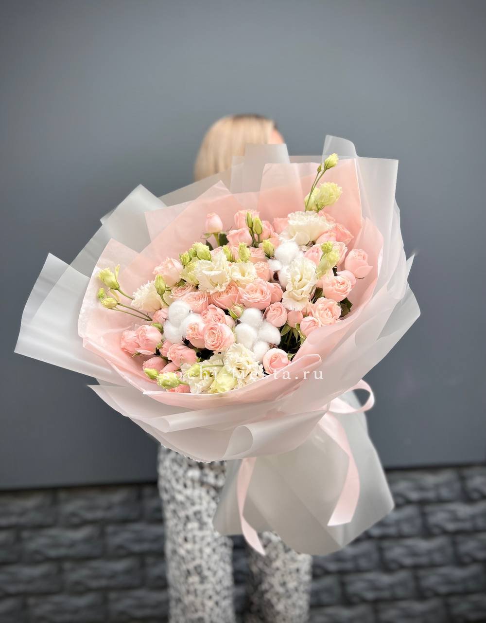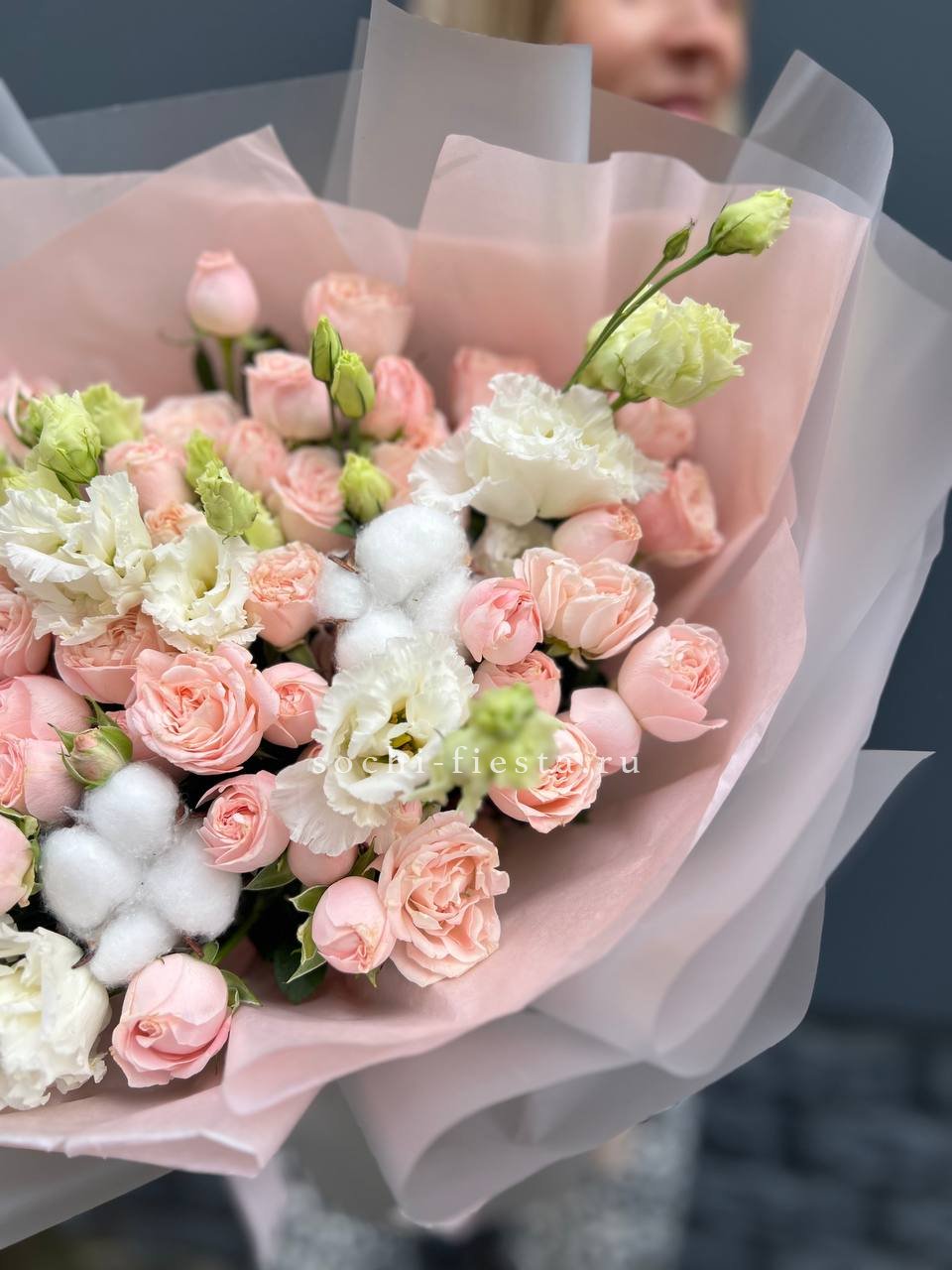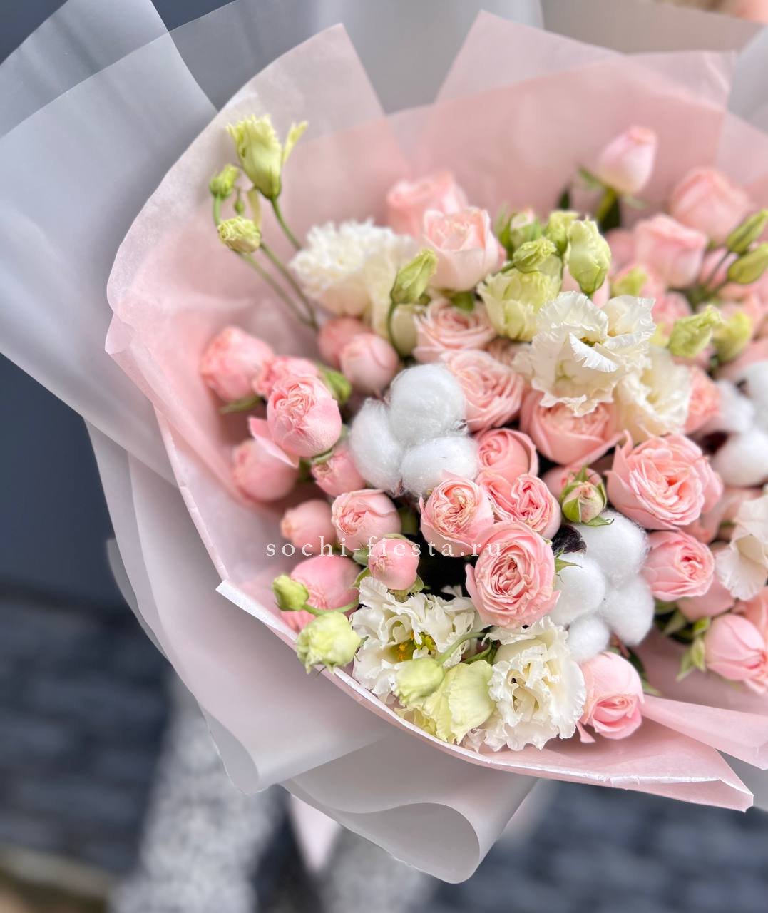 кустовые розы, эустома, хлопок, лента и дизайнерская пленка.