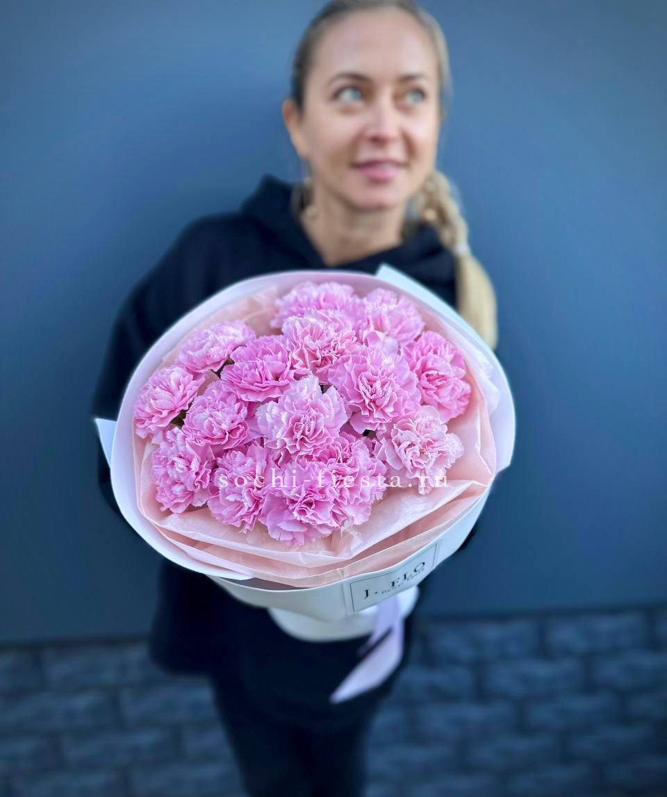 Букет из пятнадцати белых диантусов вписывается в любое пространство благодаря компактной форме. Цветы долго сохраняют свежесть и не требуют сложного ухода.