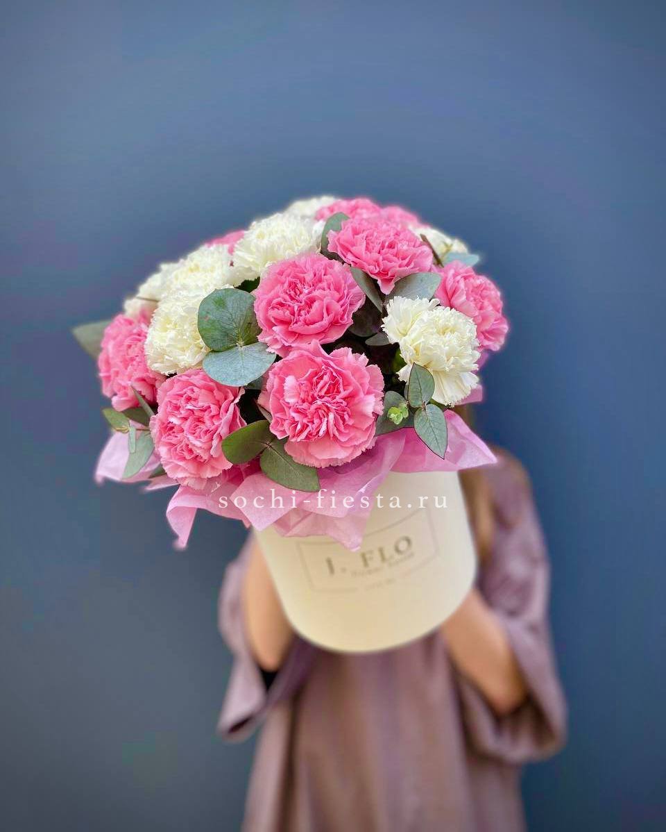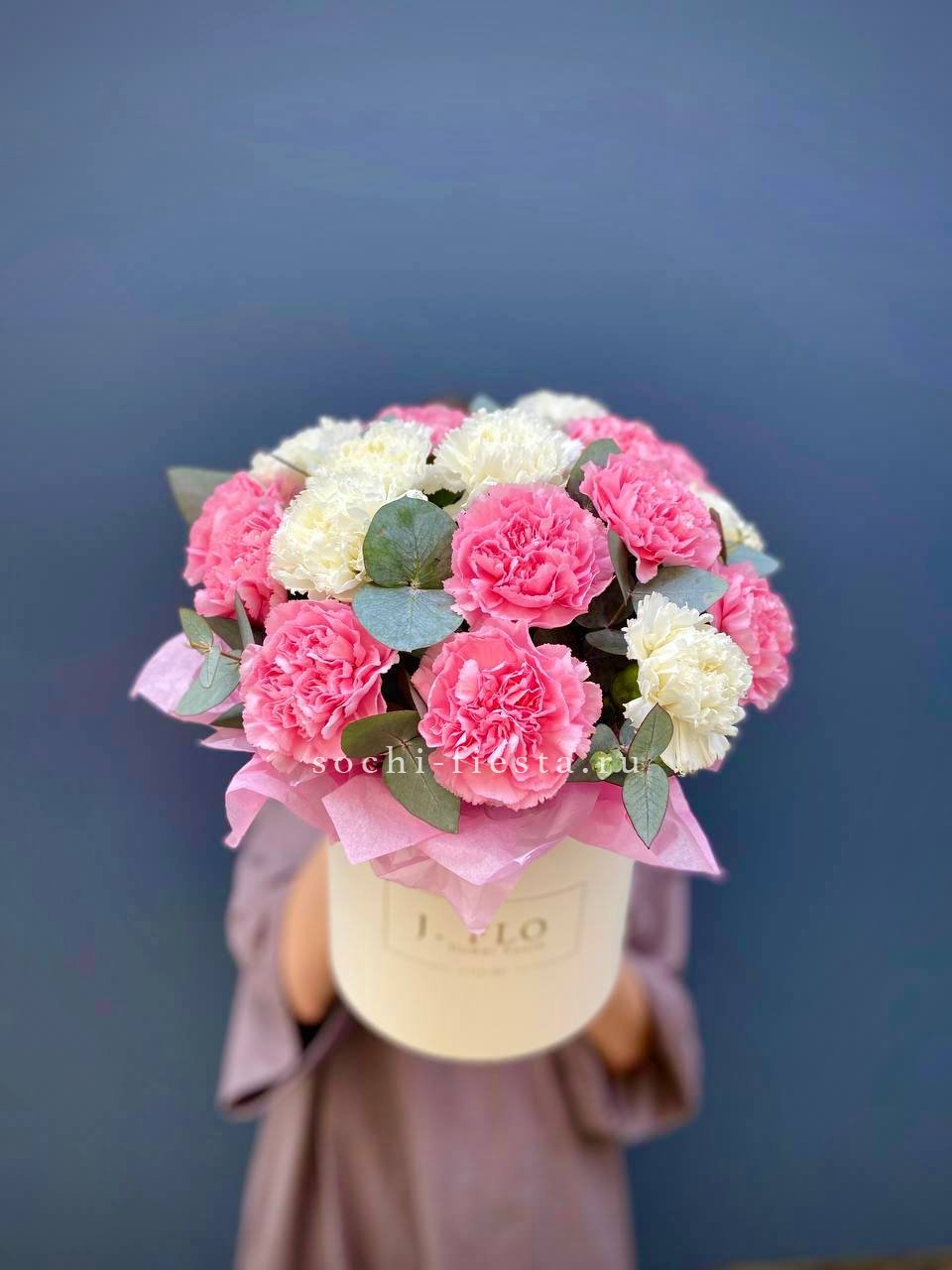 Семь кремовых диантусов раскрываются мягкими многослойными головками. Эвкалипт добавляет воздуха между бутонами и создает легкую асимметрию в общей форме.