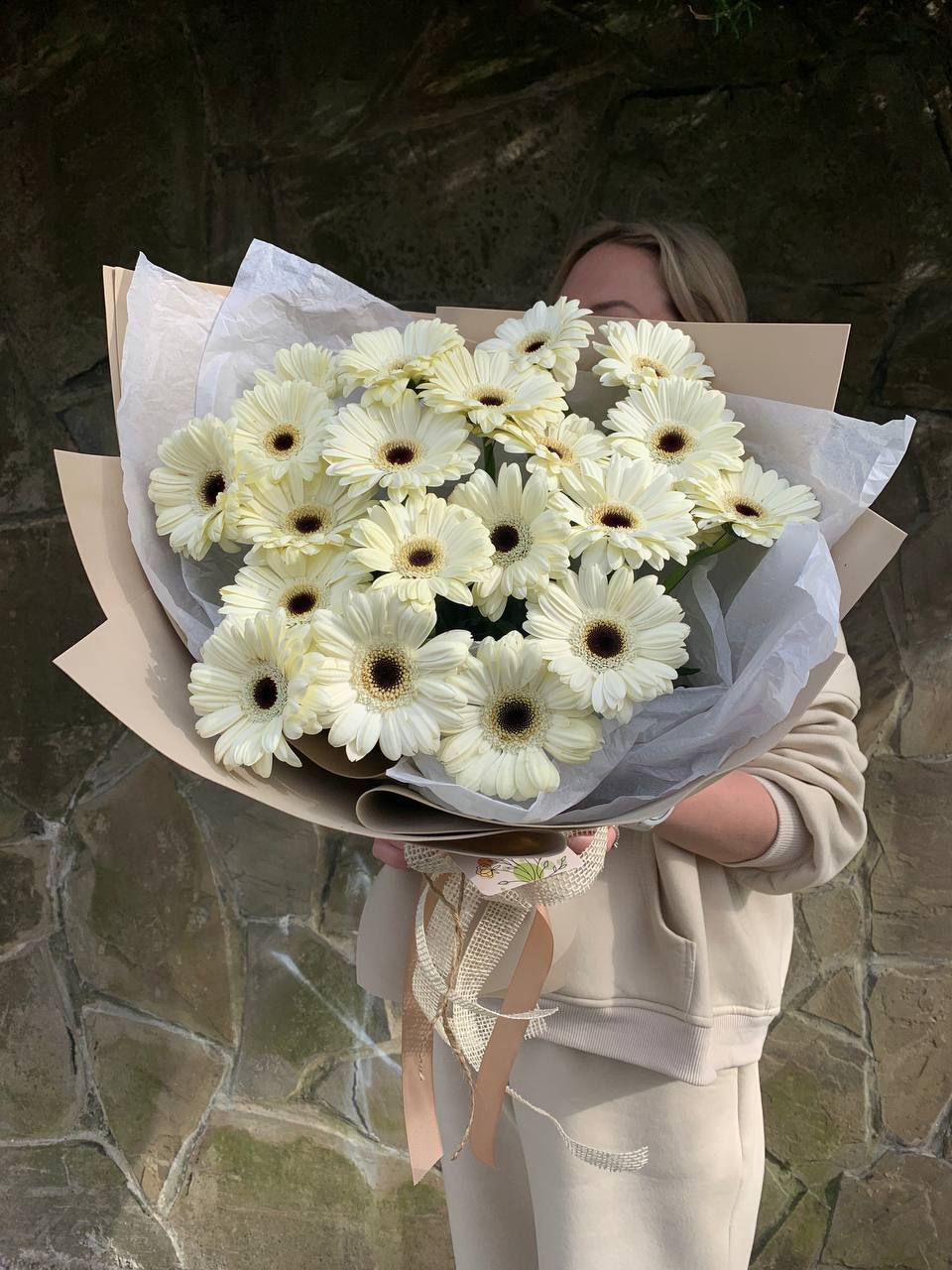 Охапка разноцветных гербер впечатляет масштабом и насыщенностью палитры. Множество раскрытых бутонов создаёт объёмное цветовое пятно, которое мгновенно преображает пространство вокруг.