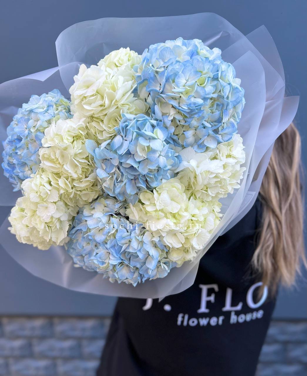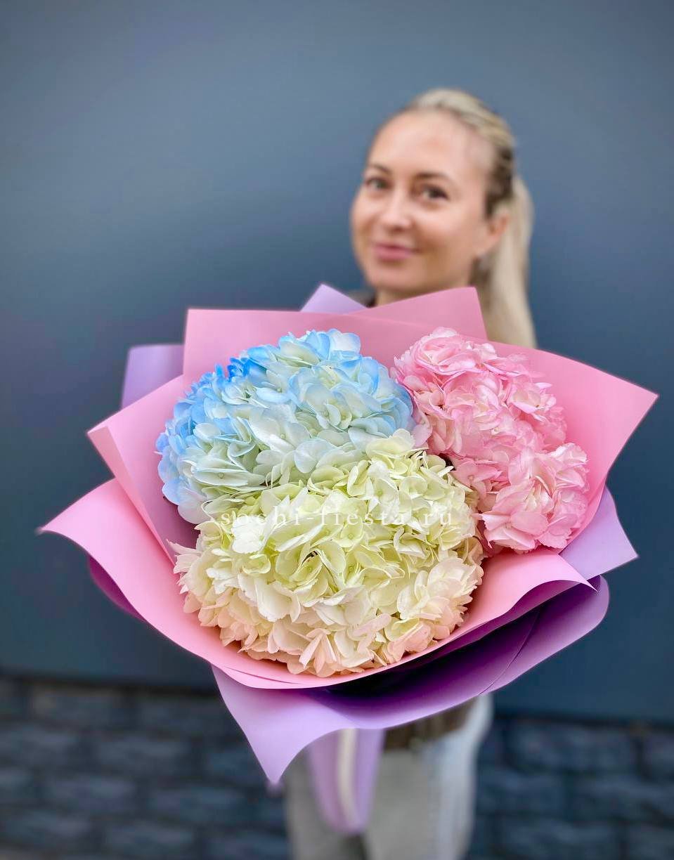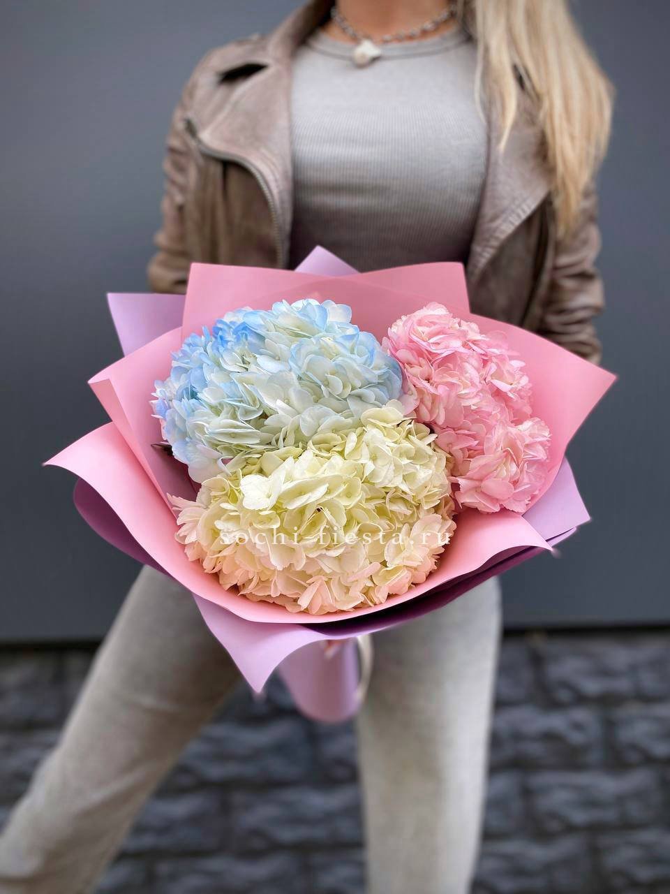 Букет из семи гортензий объединяет разные оттенки в единую композицию с живым ритмом. Переходы цвета создают динамику, а плотные соцветия формируют выразительный объём.