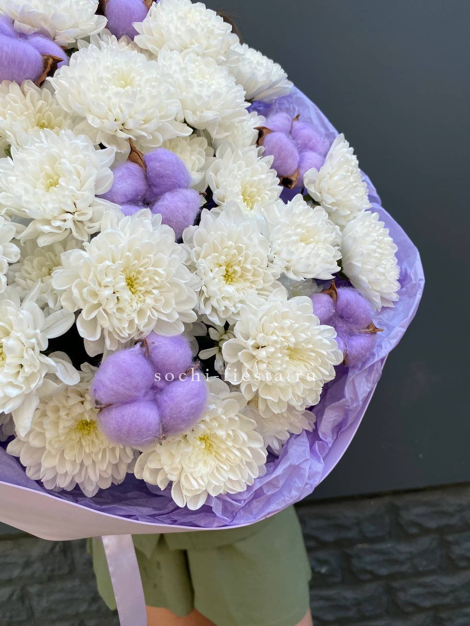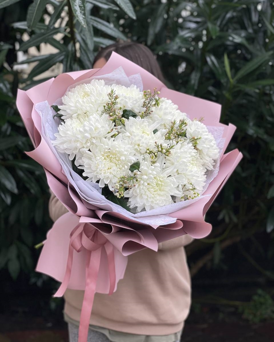 хризантема одноголовая - 9 шт., лента, дизайнерская упаковка.