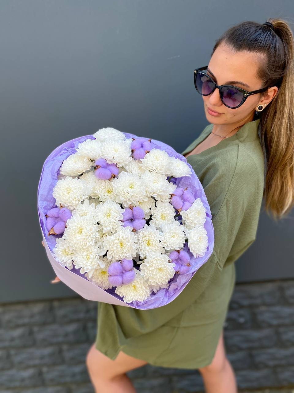 Девять крупных шаров фиолетовой хризантемы собраны в плотную округлую форму. Насыщенный оттенок создает глубину и объем, а упаковка подчёркивает графичность силуэта.