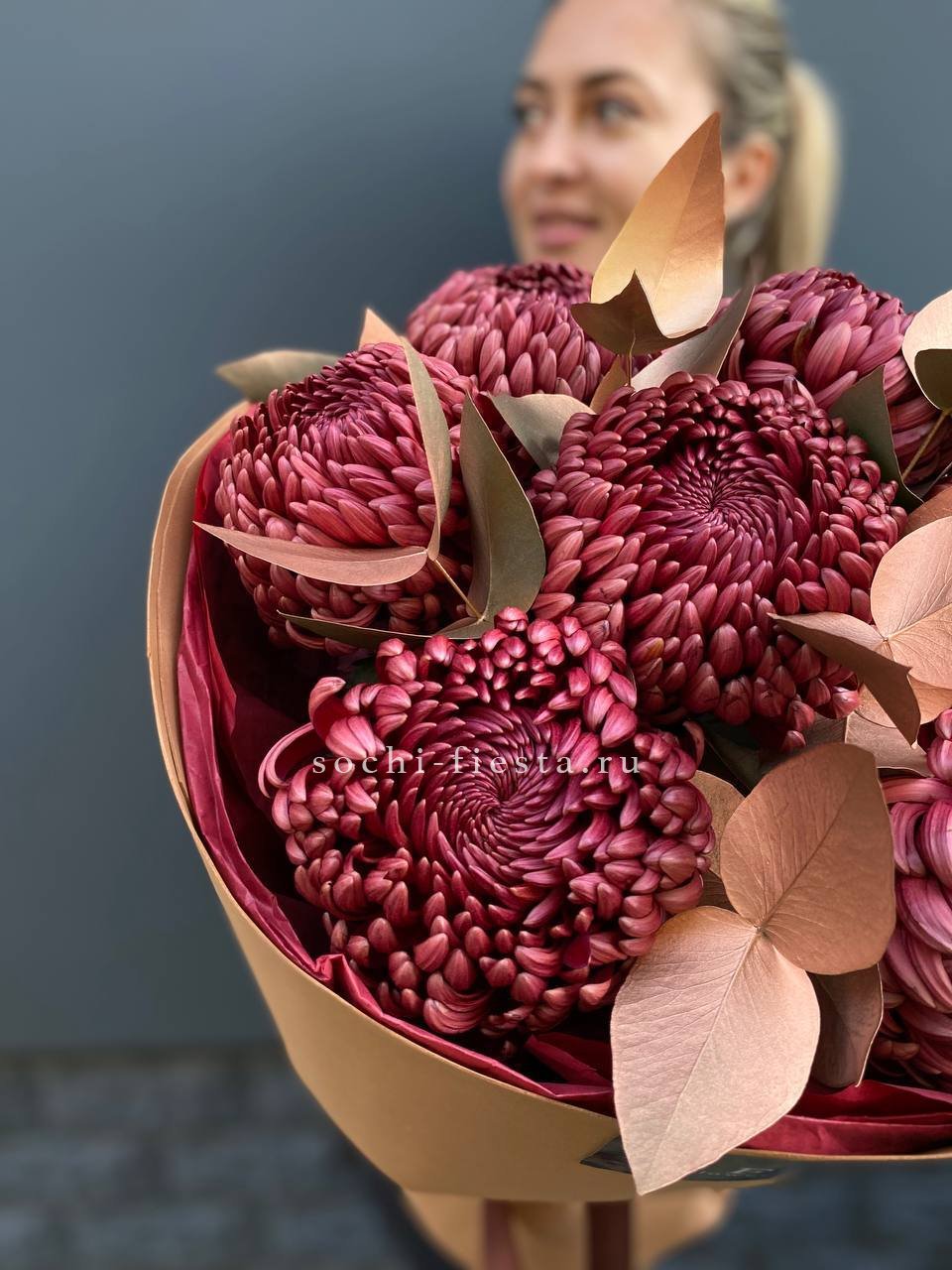 хризантемы - 7 шт, эвкалипт,  лента, дизайнерская упаковка.