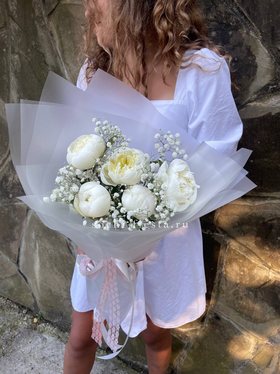 Пять белых пионов сорта Дюшес собраны в компактную форму и дополнены воздушной гипсофилой. Матовая упаковка создает спокойный фон для объемных бутонов.