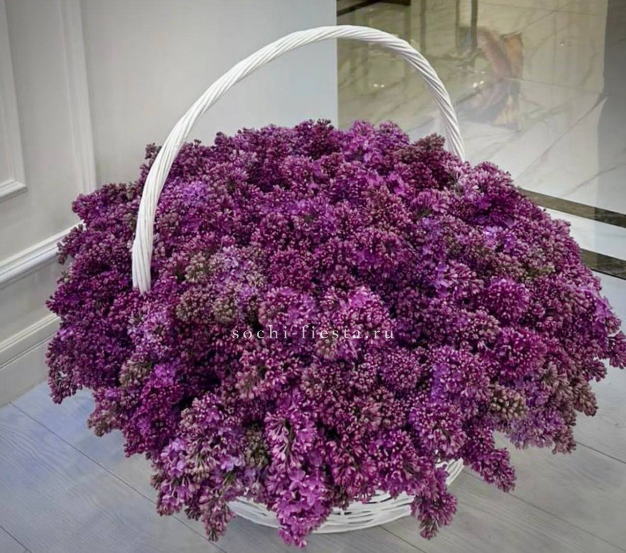 Сто одна ветка душистой сирени в плетёной корзине наполняет пространство весенним ароматом. Пышные соцветия создают объёмную шапку живого цвета и свежести.