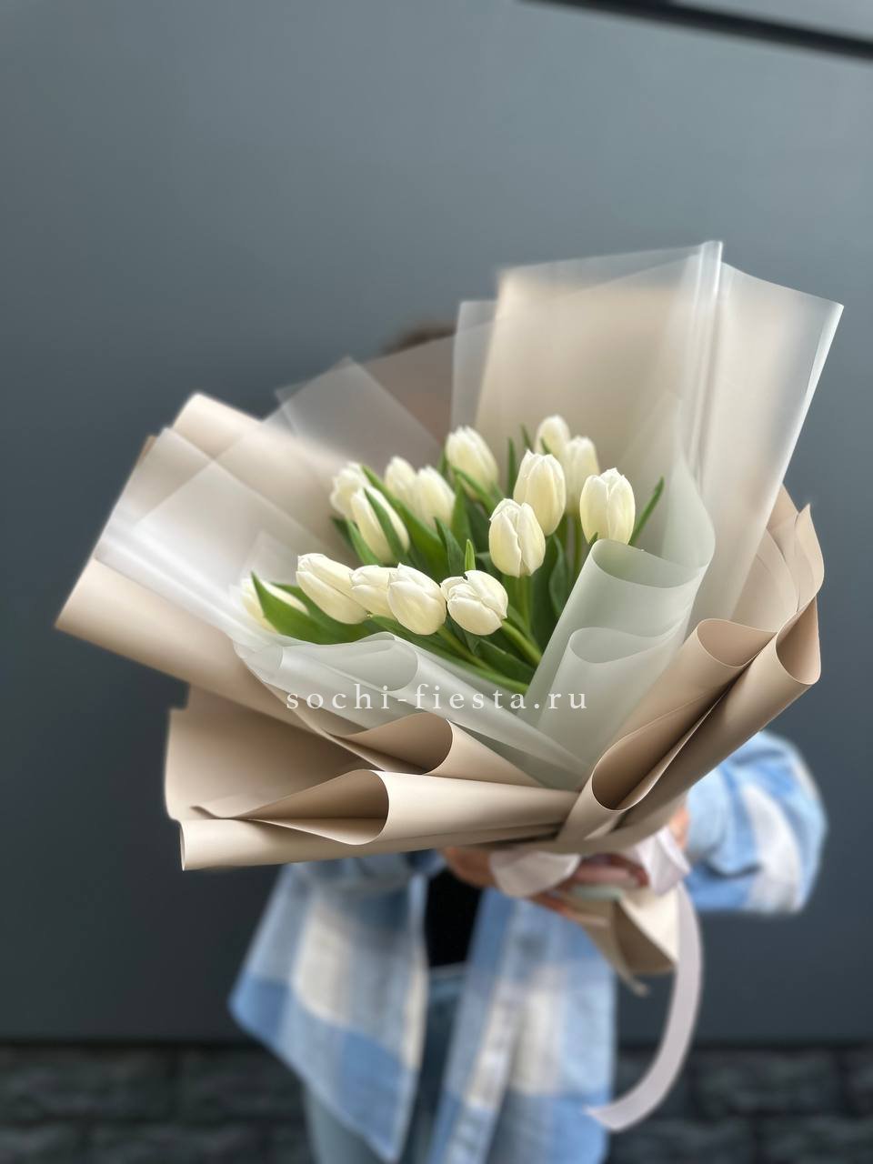 Тридцать семь тюльпанов создают яркое цветовое пятно в любом интерьере. Крафтовая упаковка оставляет композицию открытой и подчёркивает графику стеблей. Букет выглядит свободно и современно.