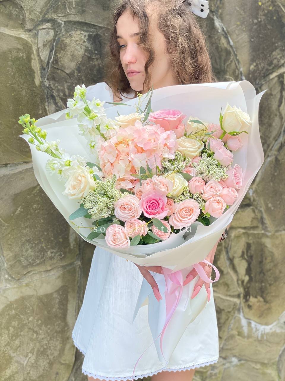 гортензия, розы одноголовые, кустовые розы, вероника (аналог вне сезона), маттиола (аналог вне сезона), эвкалипт, лента, дизайнерская упаковка.