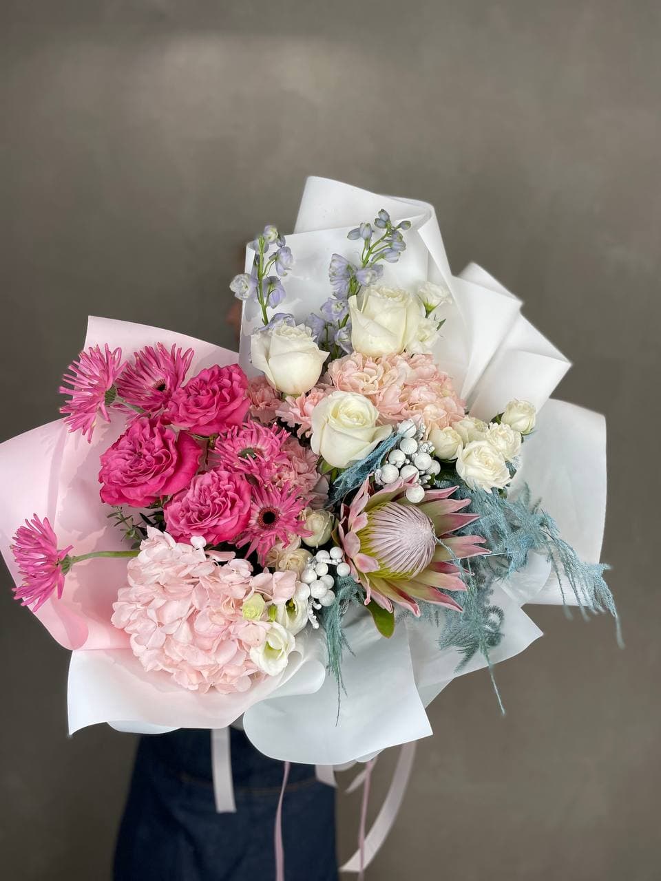 гортензия, белая роза, розовая роза, гербера, эустома, декоративная зелень, эвкалипт дизайнерское оформление, лента.