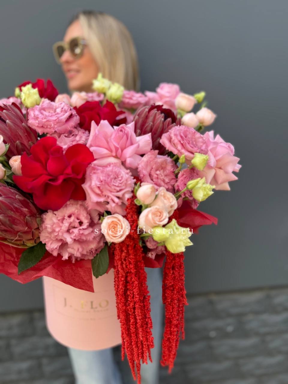 Протея с её графичными соцветиями задаёт ритм всей композиции. Амарант свисает мягкими нитями, эустома добавляет воздуха, а кустовые розы собирают форму в плотный цилиндр.
