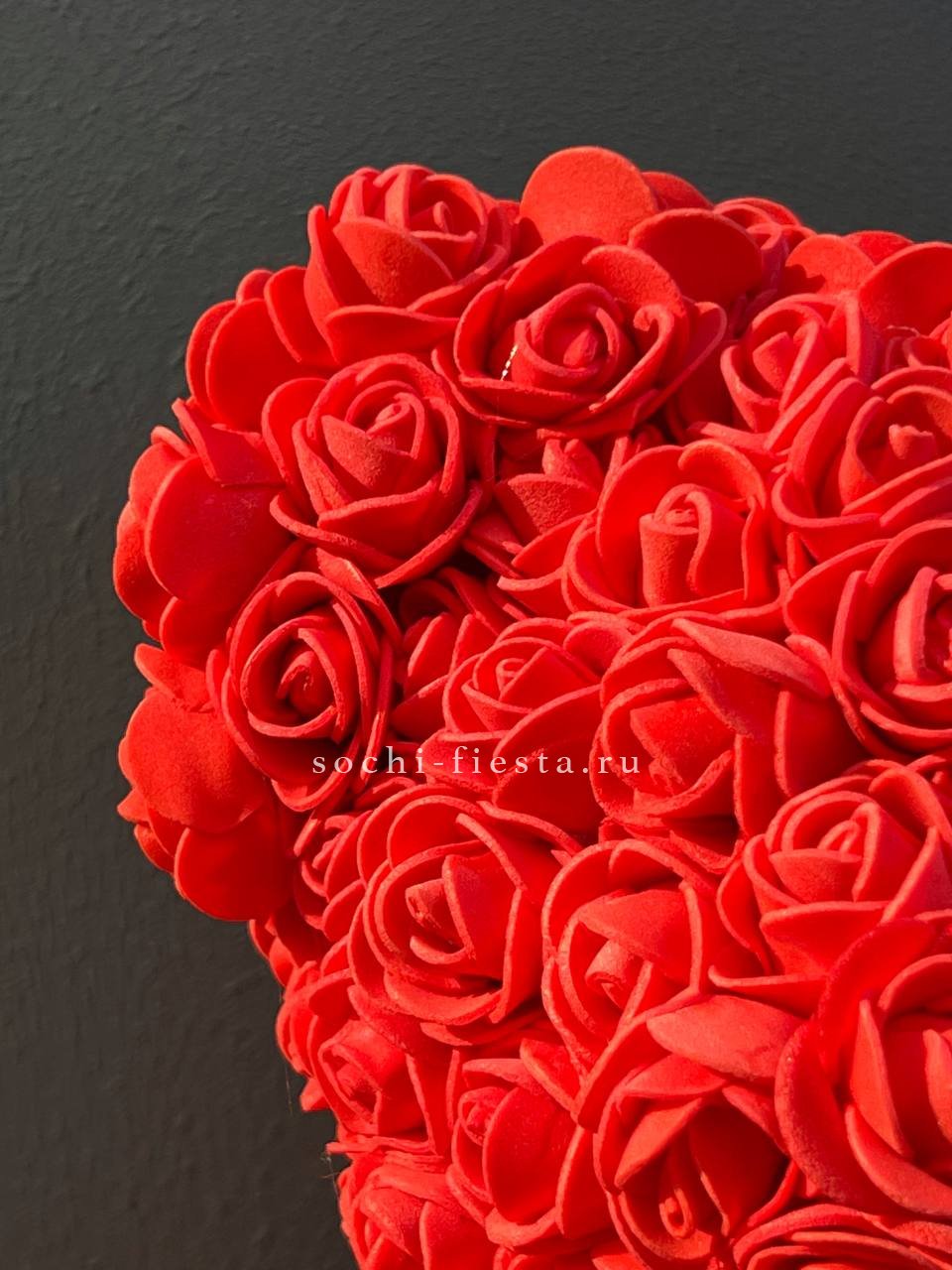 Фигурка медведя собрана из бутонов насыщенного алого оттенка. Каждый лепесток из фоамирана сохраняет форму и цвет без изменений. Компактная композиция для тех, кто ценит долговечность.