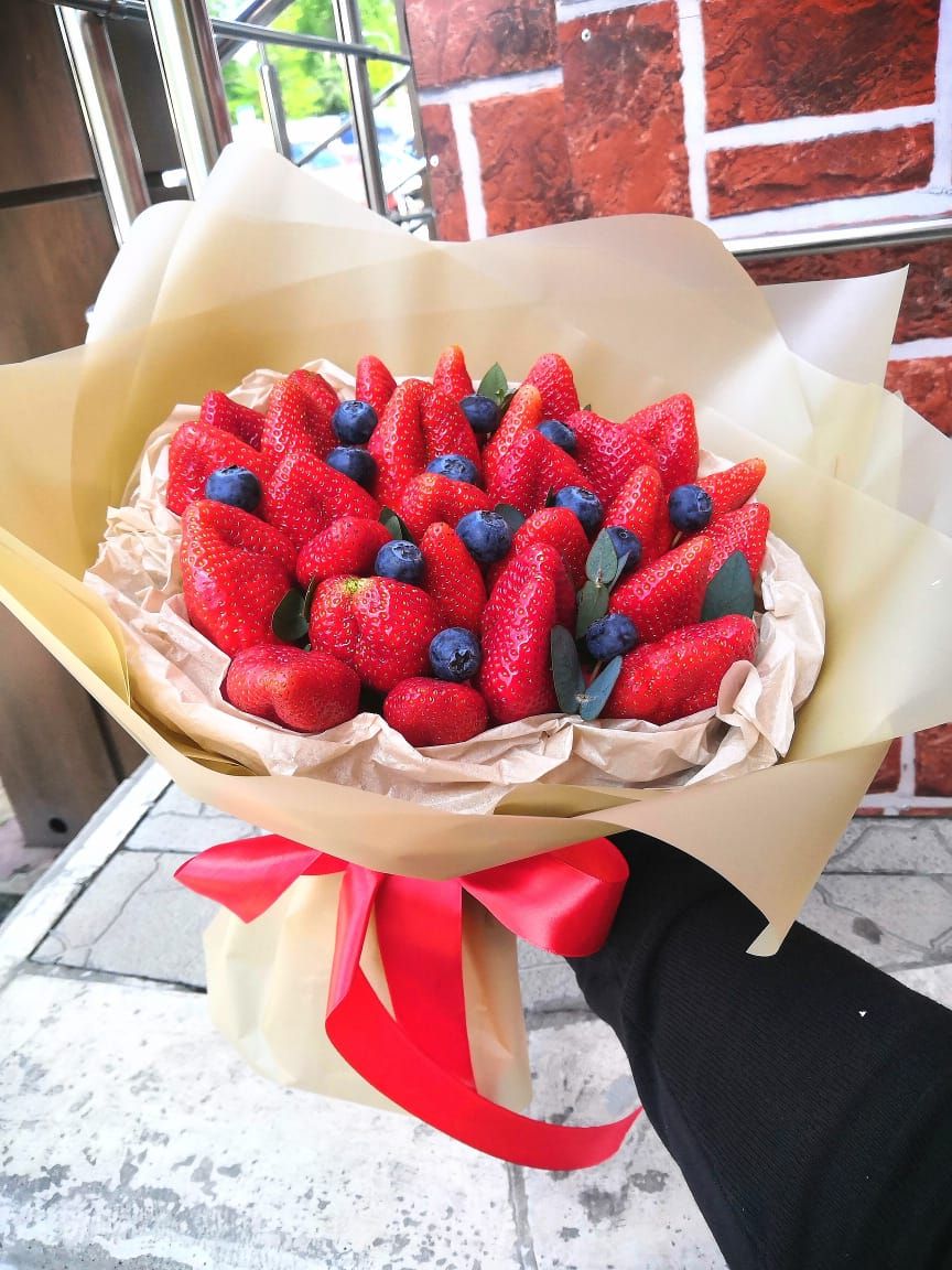500-550г. ароматной клубники, голубика, лента, крафт.