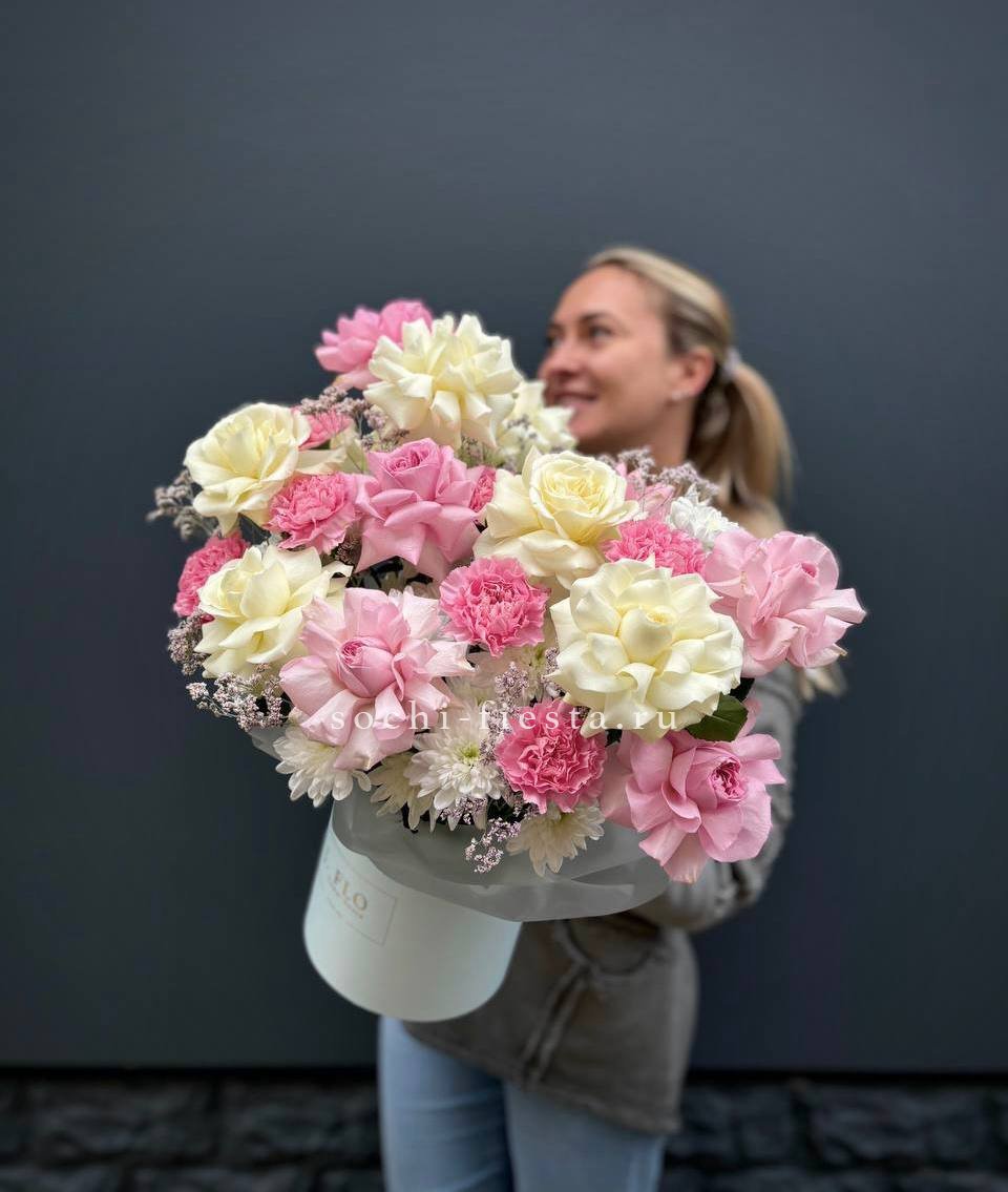 Для заказа товара "Коробка французских роз и диантусов "Бони"" с доставкой в Перми нажмите в корзину