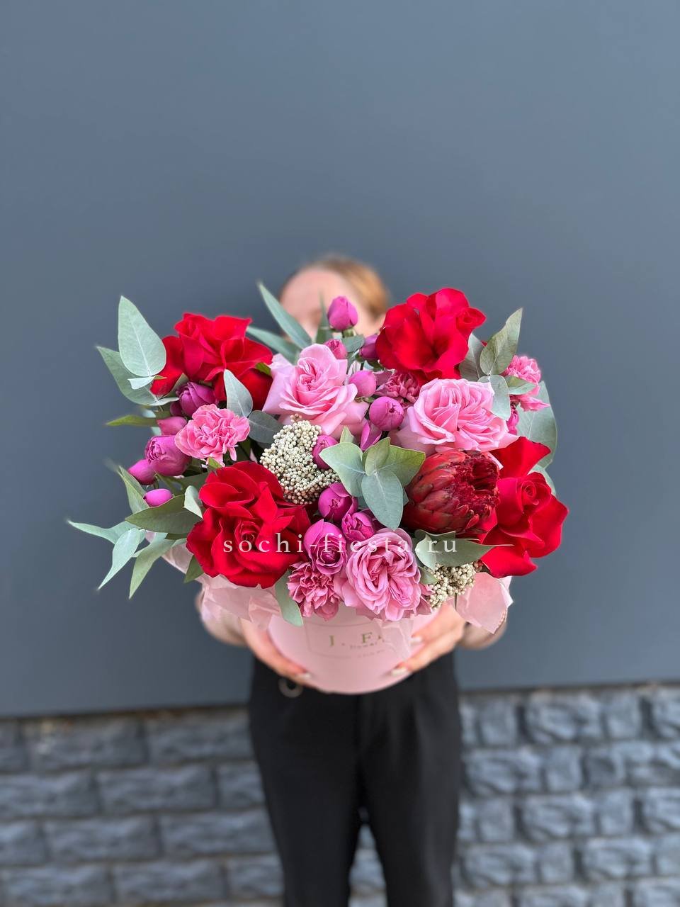 красная и розовая роза, озатамус, диантус, мисти баблс, эвкалипт, бокс 20.