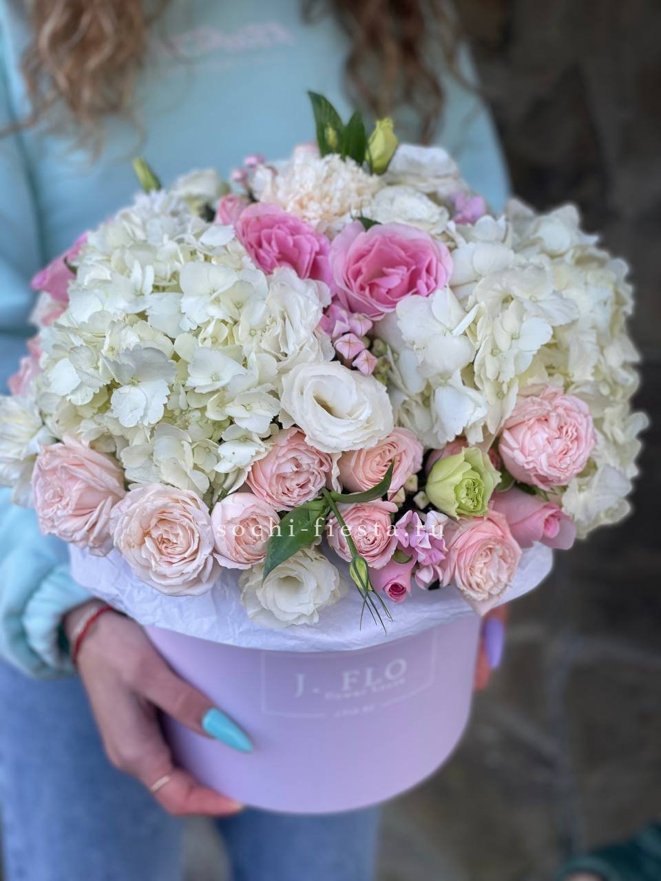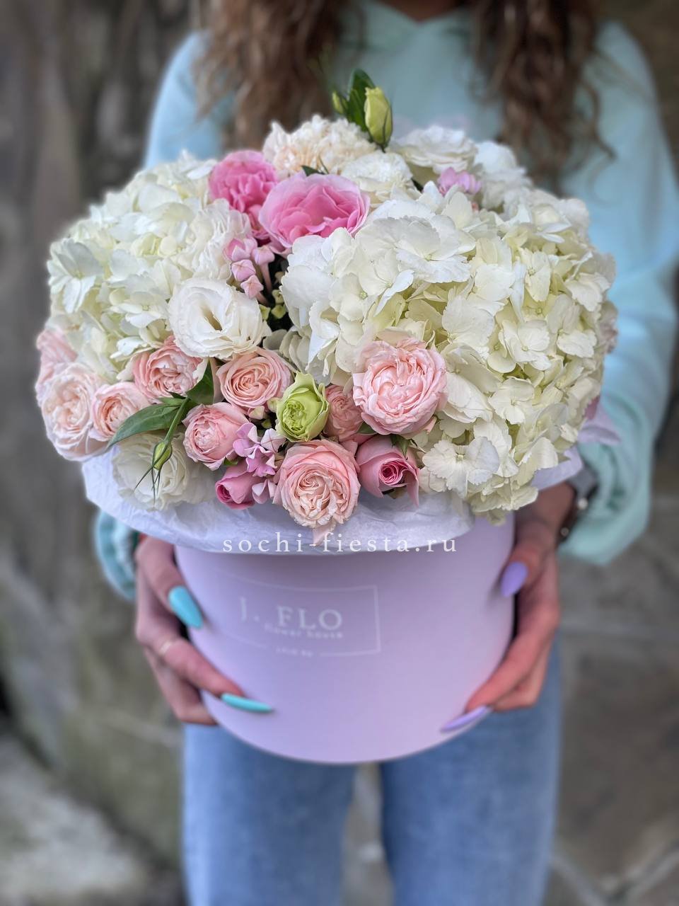Масштабная композиция в цилиндре собирает пионовидные розы, гортензию и георгины в плотную объемную форму. Высота и диаметр создают выразительное присутствие в интерьере.