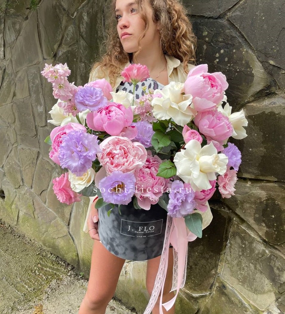 Пионы распускаются пышными шапками в окружении роз и душистой маттиолы. Эустома добавляет воздушности, а эвкалипт создает свежий акцент в цилиндре.