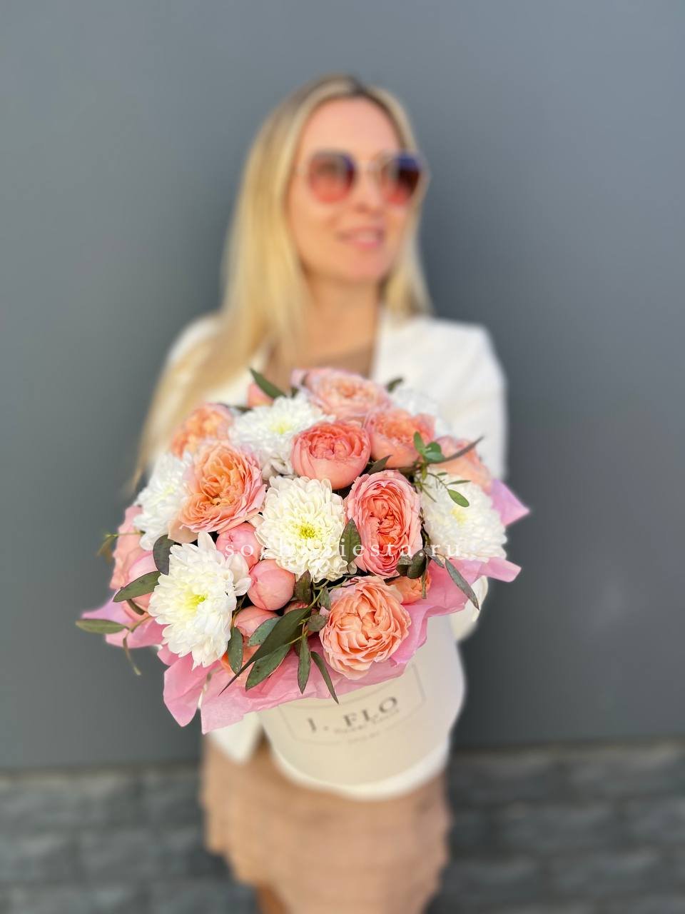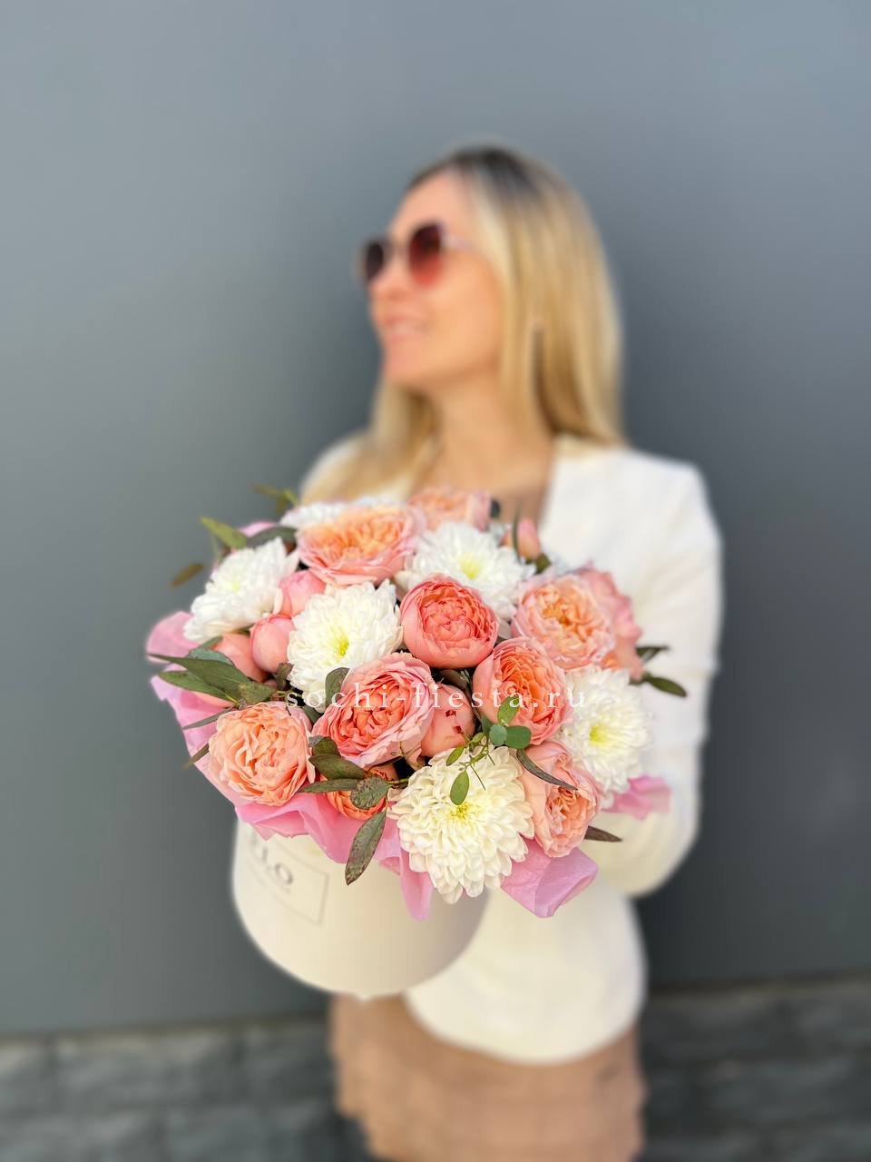 Пионовидные розы Джульетта в пудровых оттенках собраны плотно и дополнены белыми хризантемами. Эвкалипт обрамляет композицию мягкими серо-зелеными ветками.