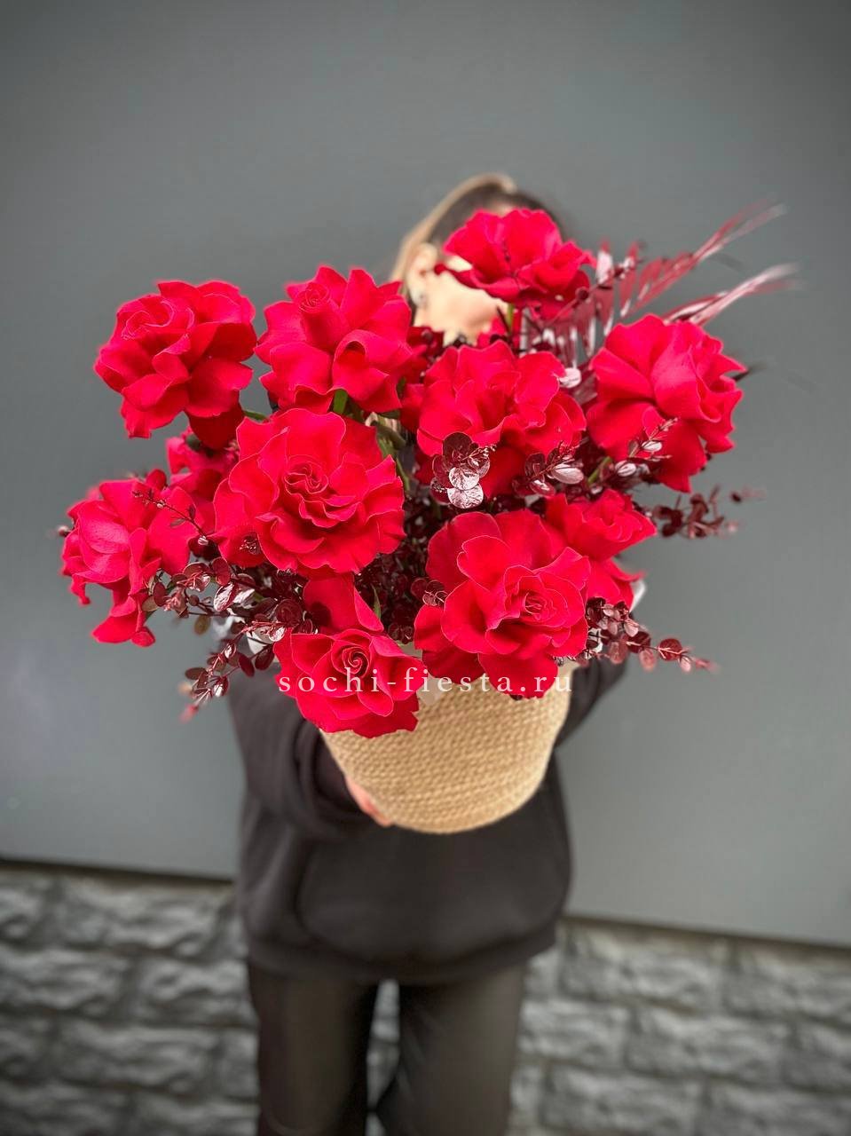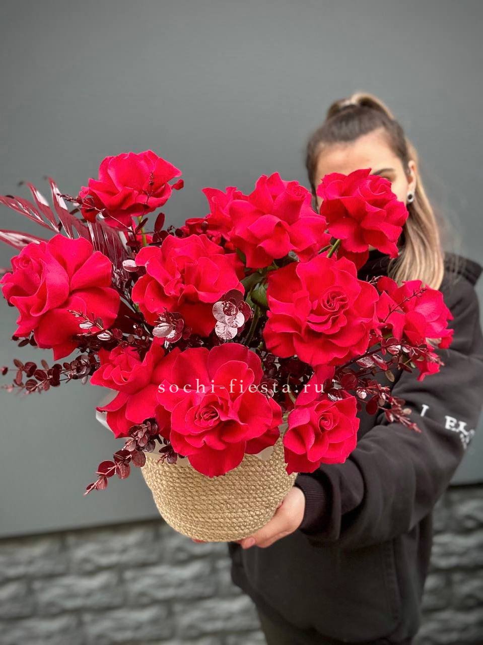розы и гацинты в джутовом кашпо.