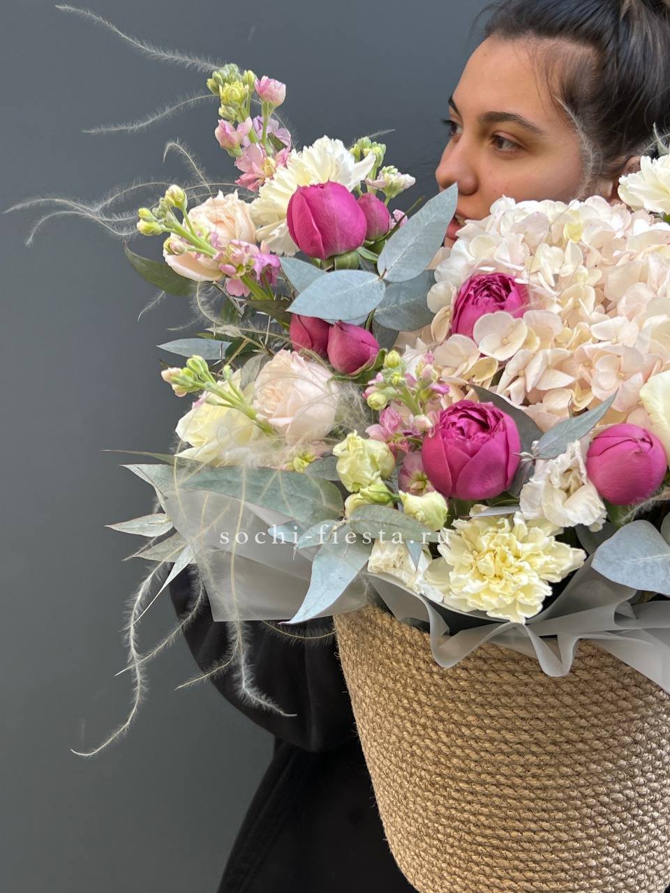 белые розы, диантусы, эустома в джутовом кашпо.