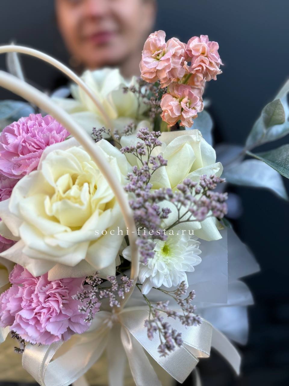Пышные головки пионовидных роз задают объём, а мелкие соцветия диантуса разбивают плотность. Гортензия добавляет воздушную текстуру, эвкалипт смягчает линии. Композиция в сумке-кашпо выглядит свободно и живо.