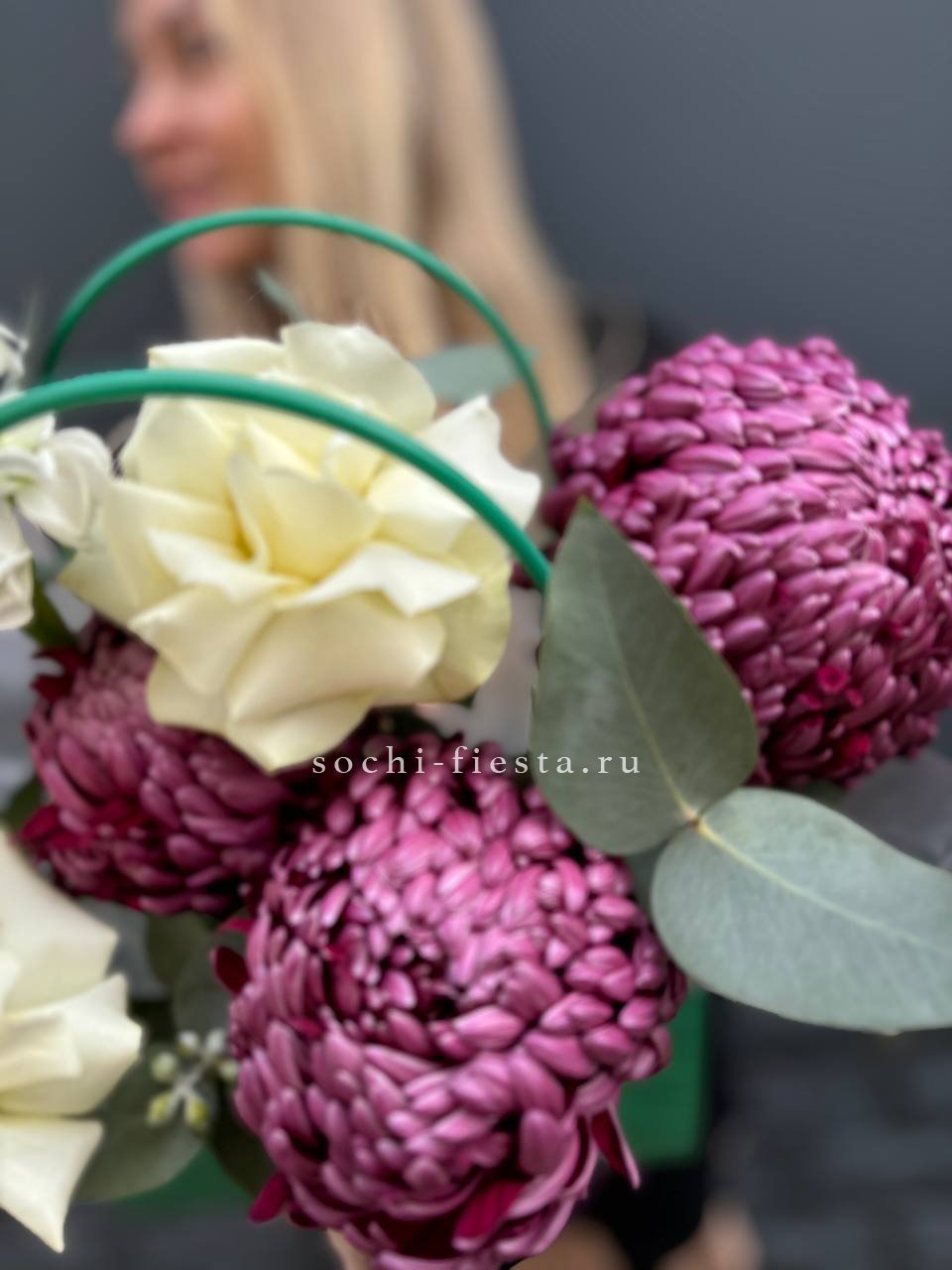 хризантемы бигуди, маттиола, розы,  эвкалипт, сумка.