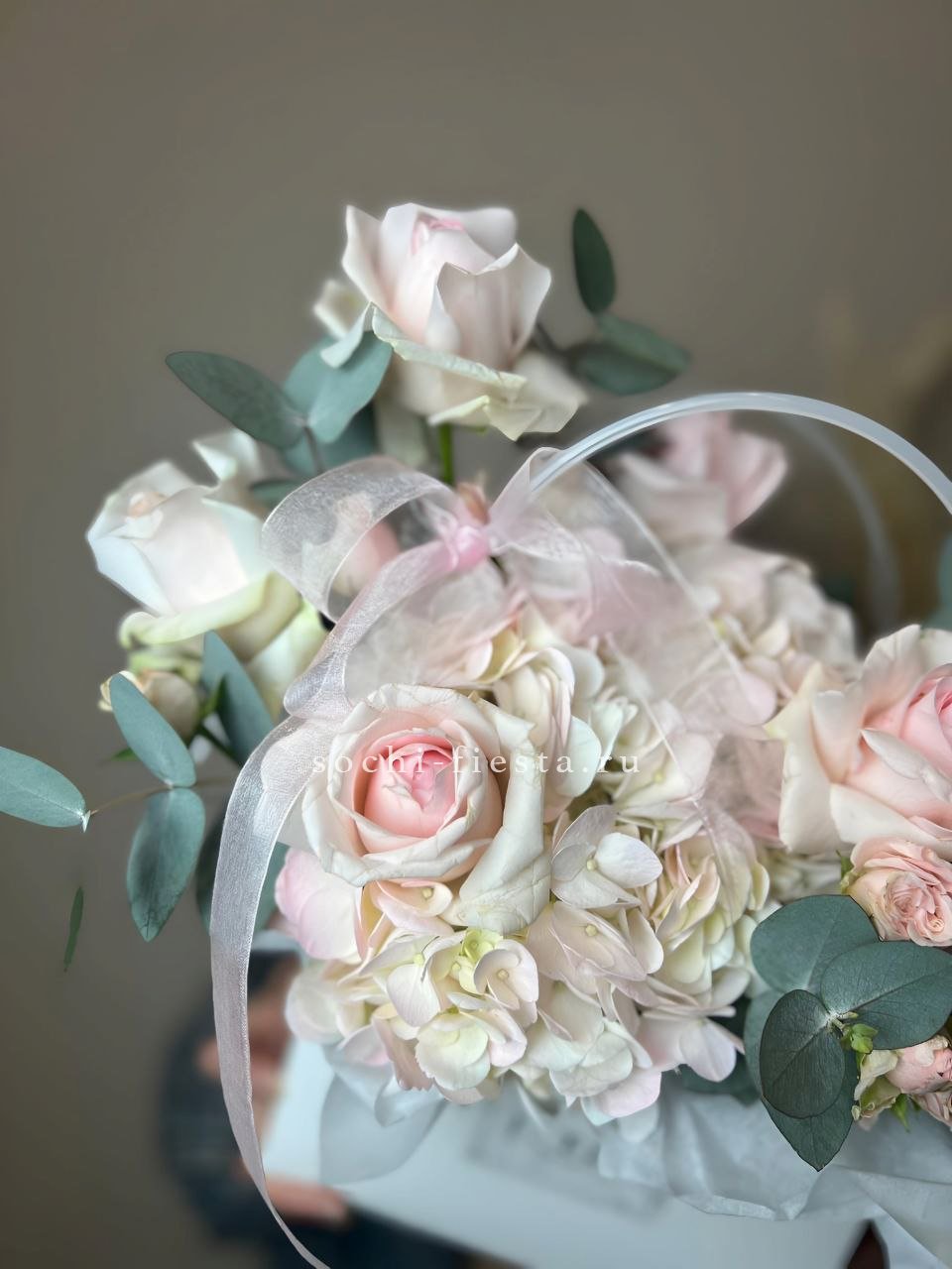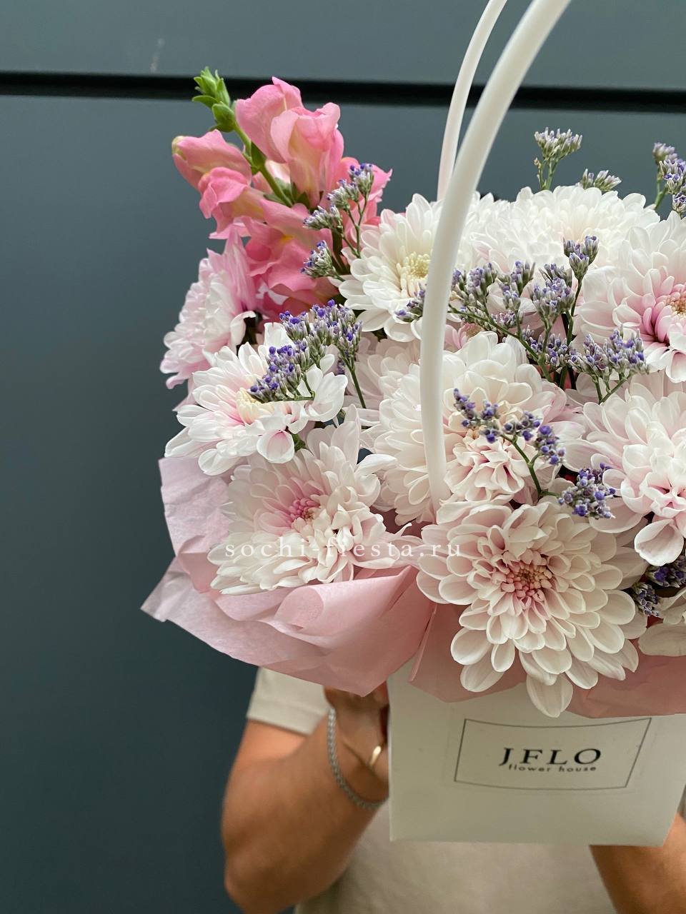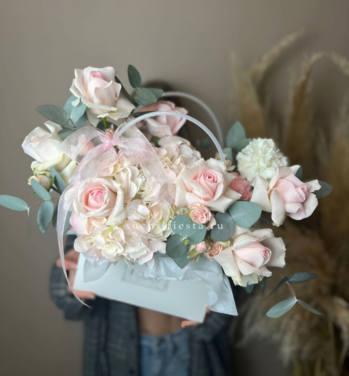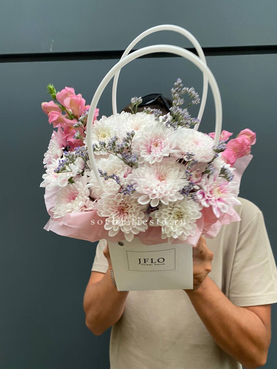 Сумочка Florence дарит ощущение солнечного утра. Альстромерии и розовые розы собраны в легкую композицию с добавлением хлопка и диантусов. Удобная форма позволяет разместить её на столе или подоконнике.