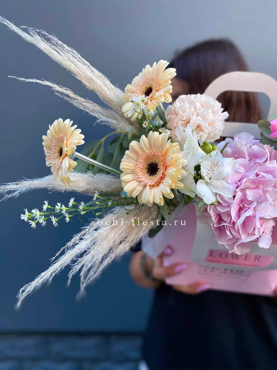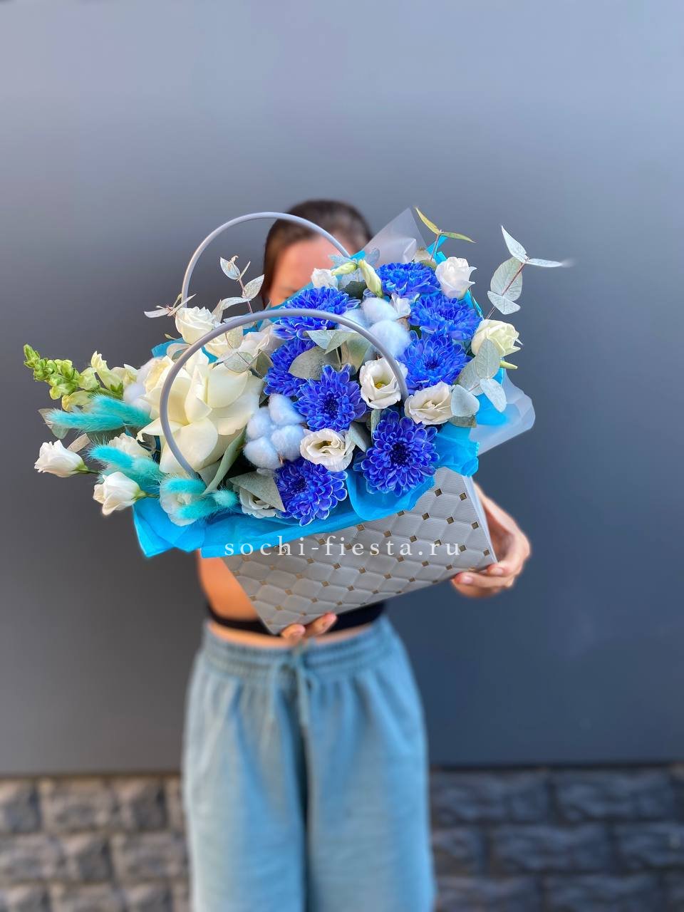гортензия, розы, эустома, эвкалипт, диантус, лента, сумка.
