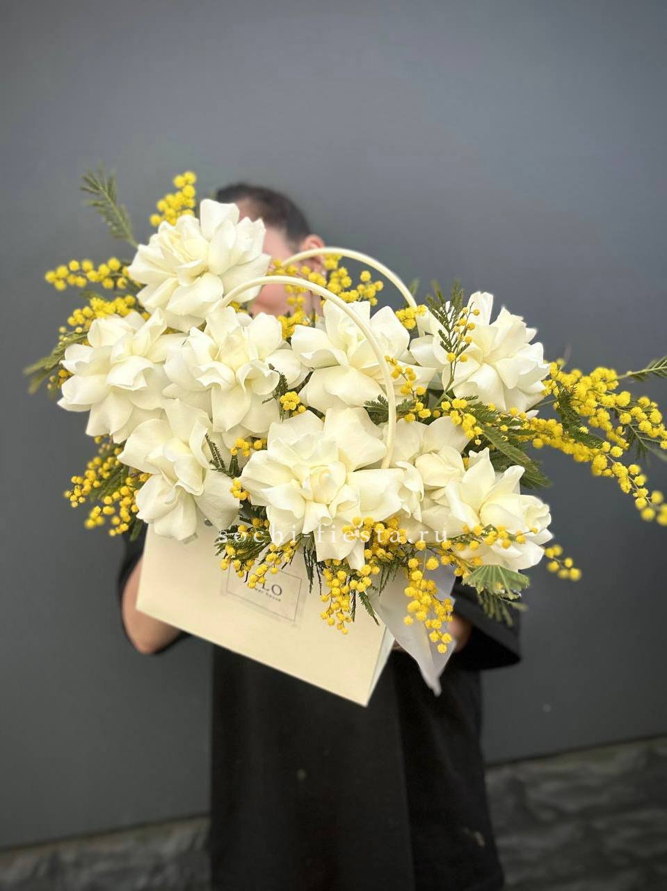 Золотистые шарики мимозы соседствуют с бутонами французских роз в удобной сумочке. Весенний акцент с южным характером.