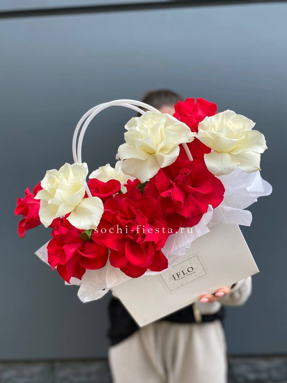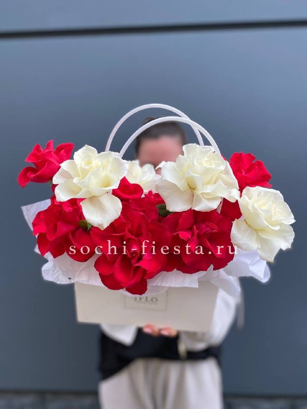 Французские розы двух оттенков собраны плотной шапкой в компактной сумочке. Белый и красный создают чёткий визуальный ритм без лишних деталей. Формат удобен для подарка или украшения пространства.