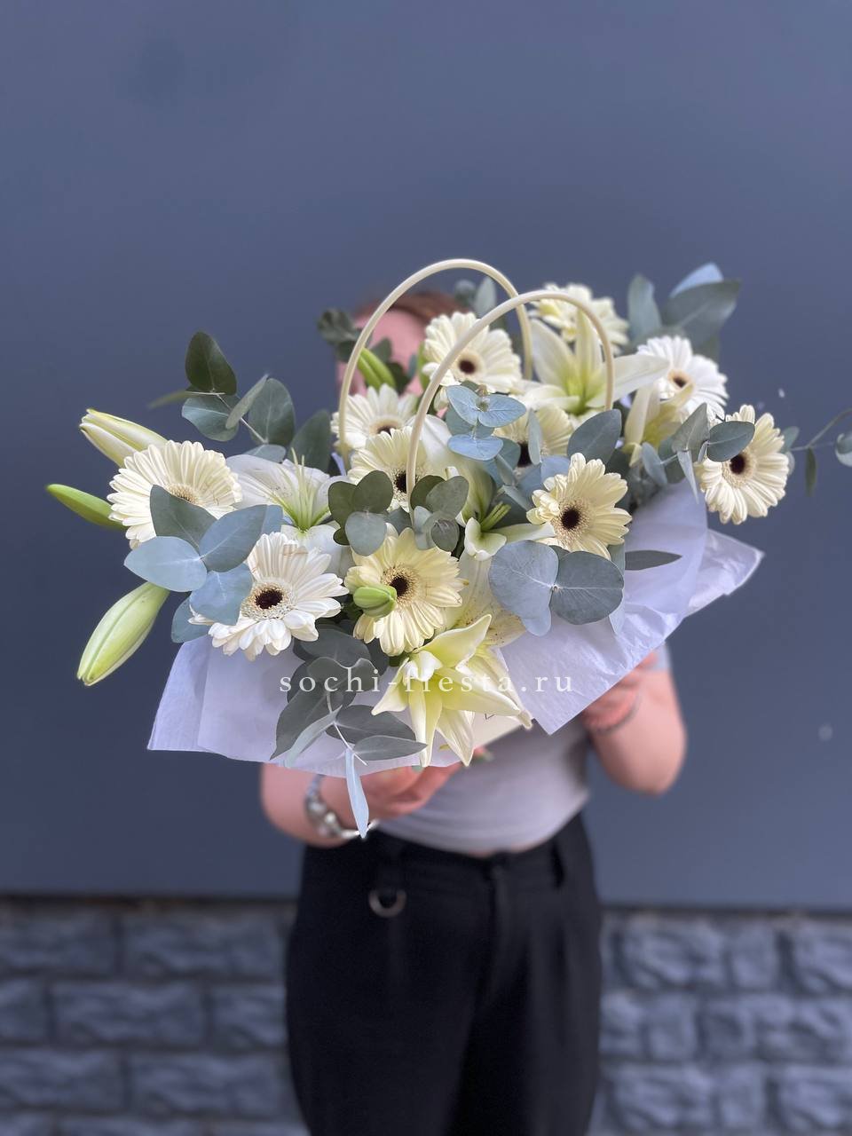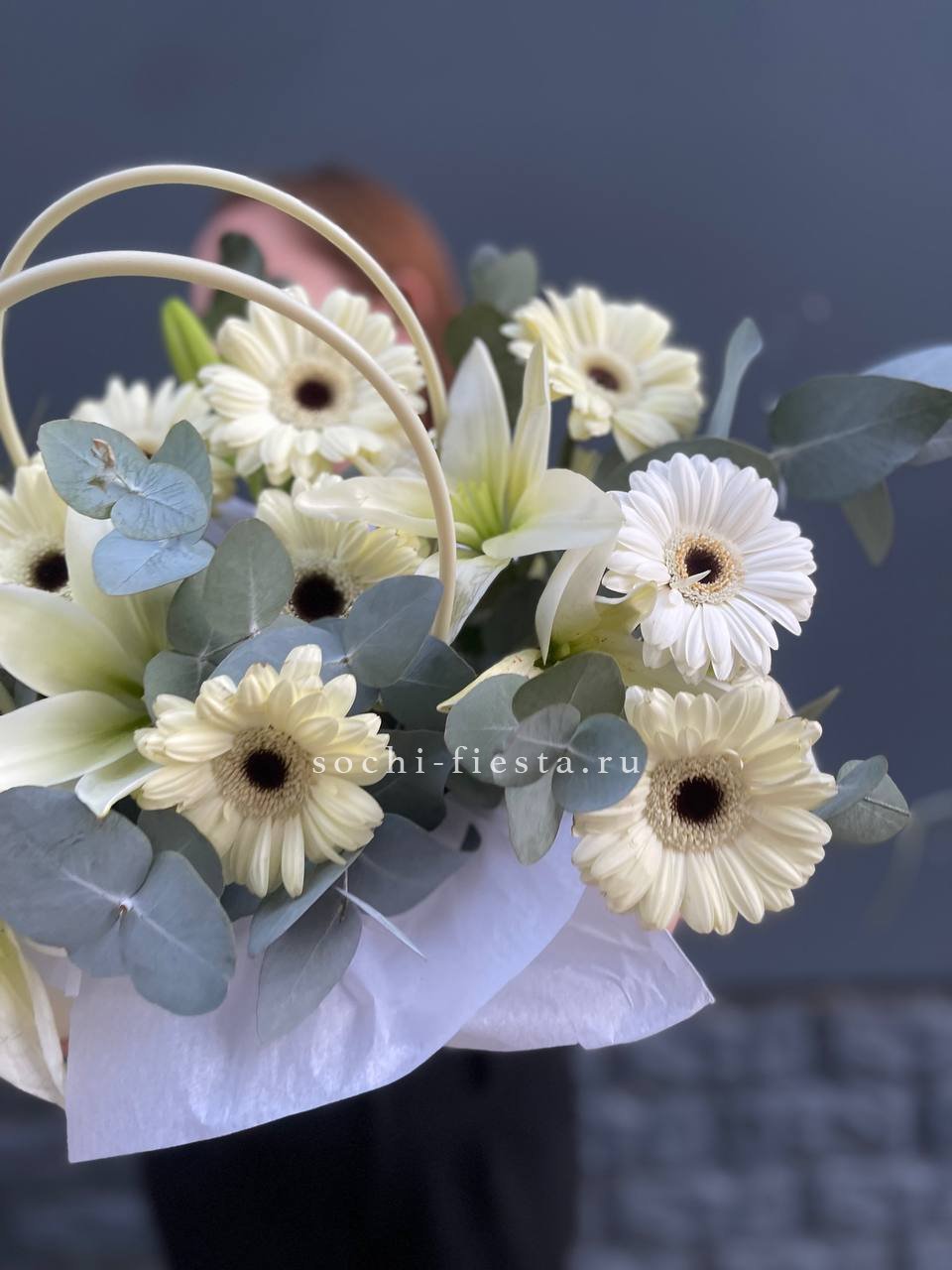 сумочка в белых тонах с лилией, герберой и эвкалиптом.