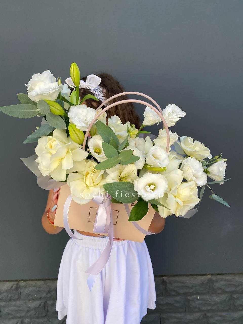 джумилия, гербера, мисти баблс, диантус, хлопок, лагурус, сумочка.