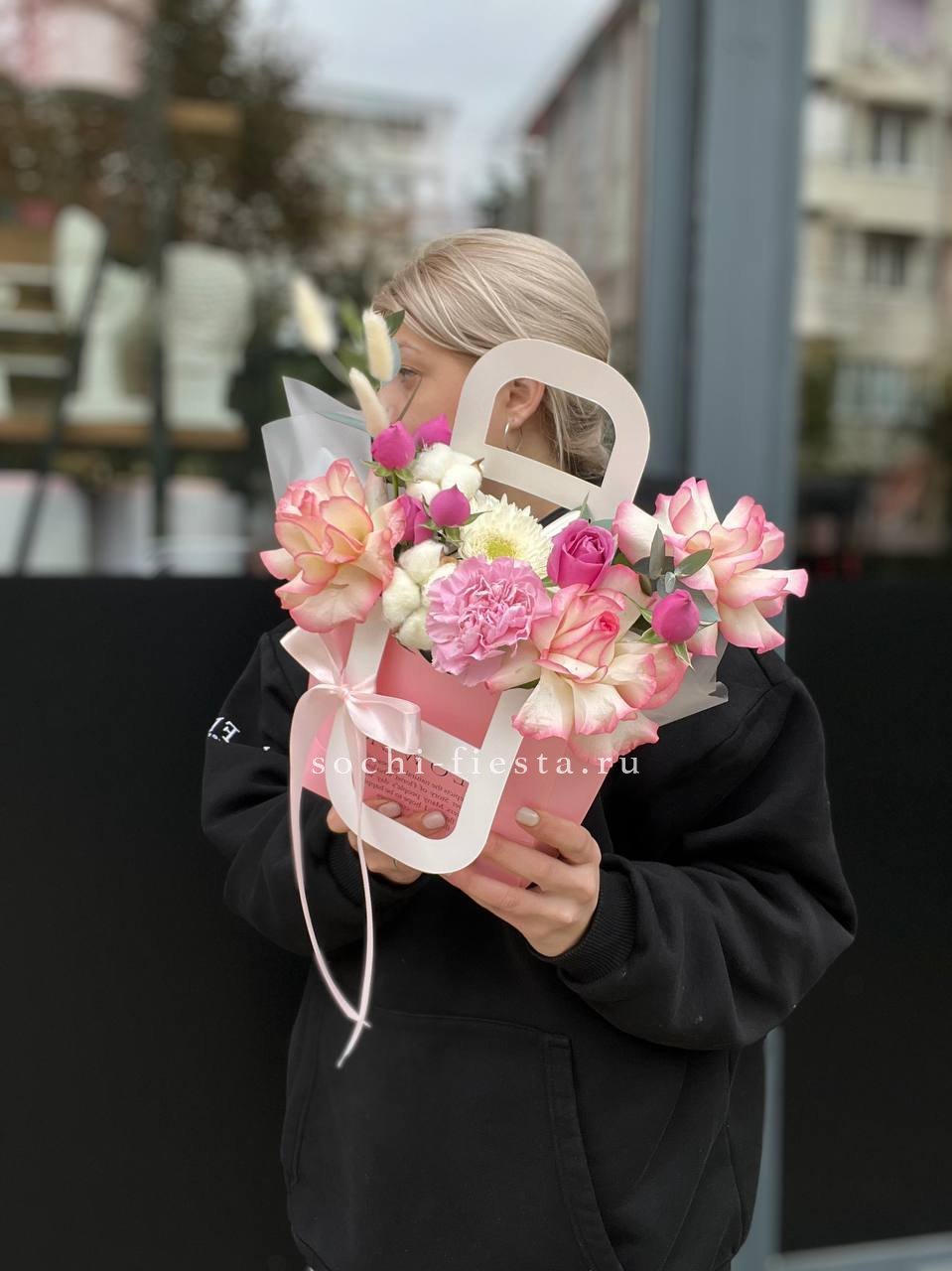 Яркая композиция в удобной сумочке объединяет розы Джумилия с герберами и воздушными соцветиями. Хлопок и лагурус добавляют природной легкости, а диантус создает цветовую динамику.