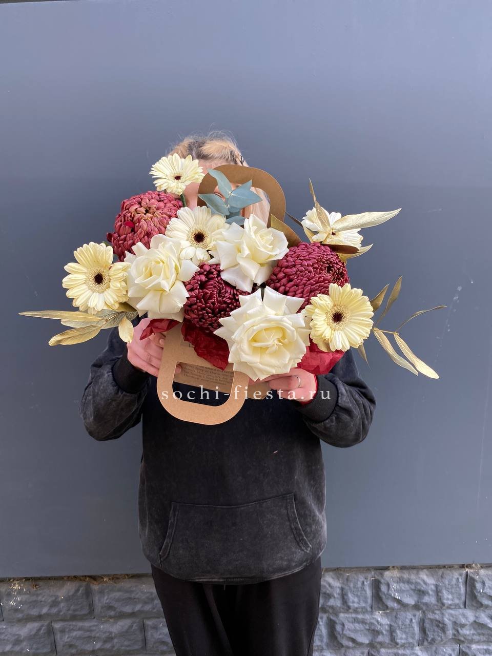 Яркая композиция в формате сумочки объединяет насыщенные герберы и белые розы. Бигуди добавляют графичности, эвкалипт завершает форму мягкими линиями.