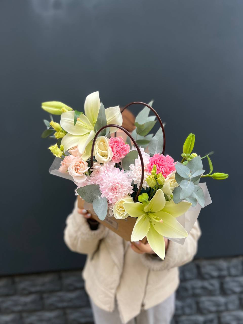 Погрузитесь в мир изысканных ароматов! Эта композиция — настоящее произведение искусства, где благородные лилии встречаются с нежными розами и воздушной эустомой. Свежий эвкалипт добавляет особые нотки. Это не просто букет, а стильный акцент, который наполнит пространство красотой и уютом. Идеально для выражения благодарности или глубокой симпатии.