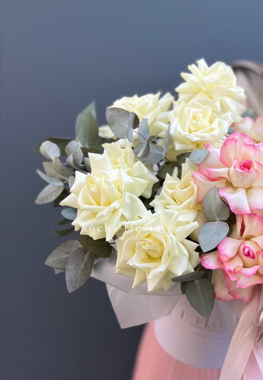Пышная композиция в округлом боксе собрана из соцветий разной формы и ритма. Гортензия создает объемную базу, герберы и розы задают яркие точки, а эустома добавляет воздушности.