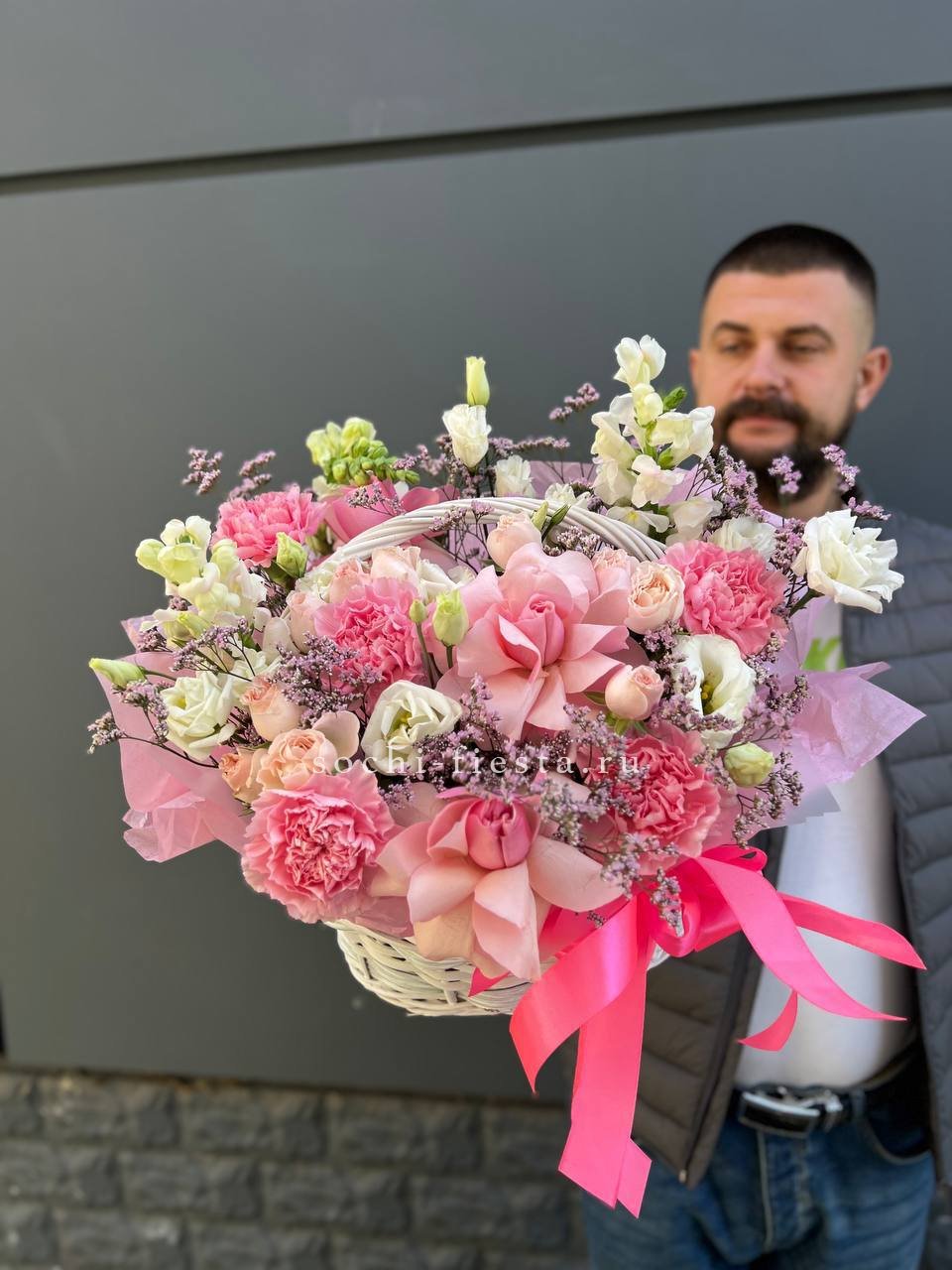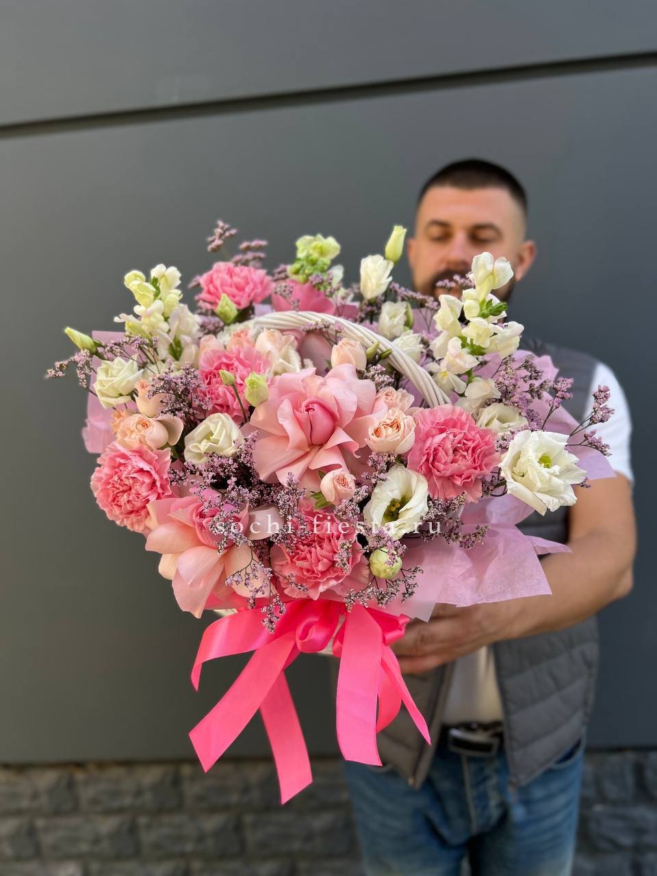 гортензия, диантус, розовая роза, эустома, гербера, корзина средняя, наполнение.