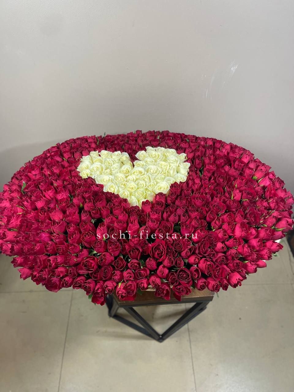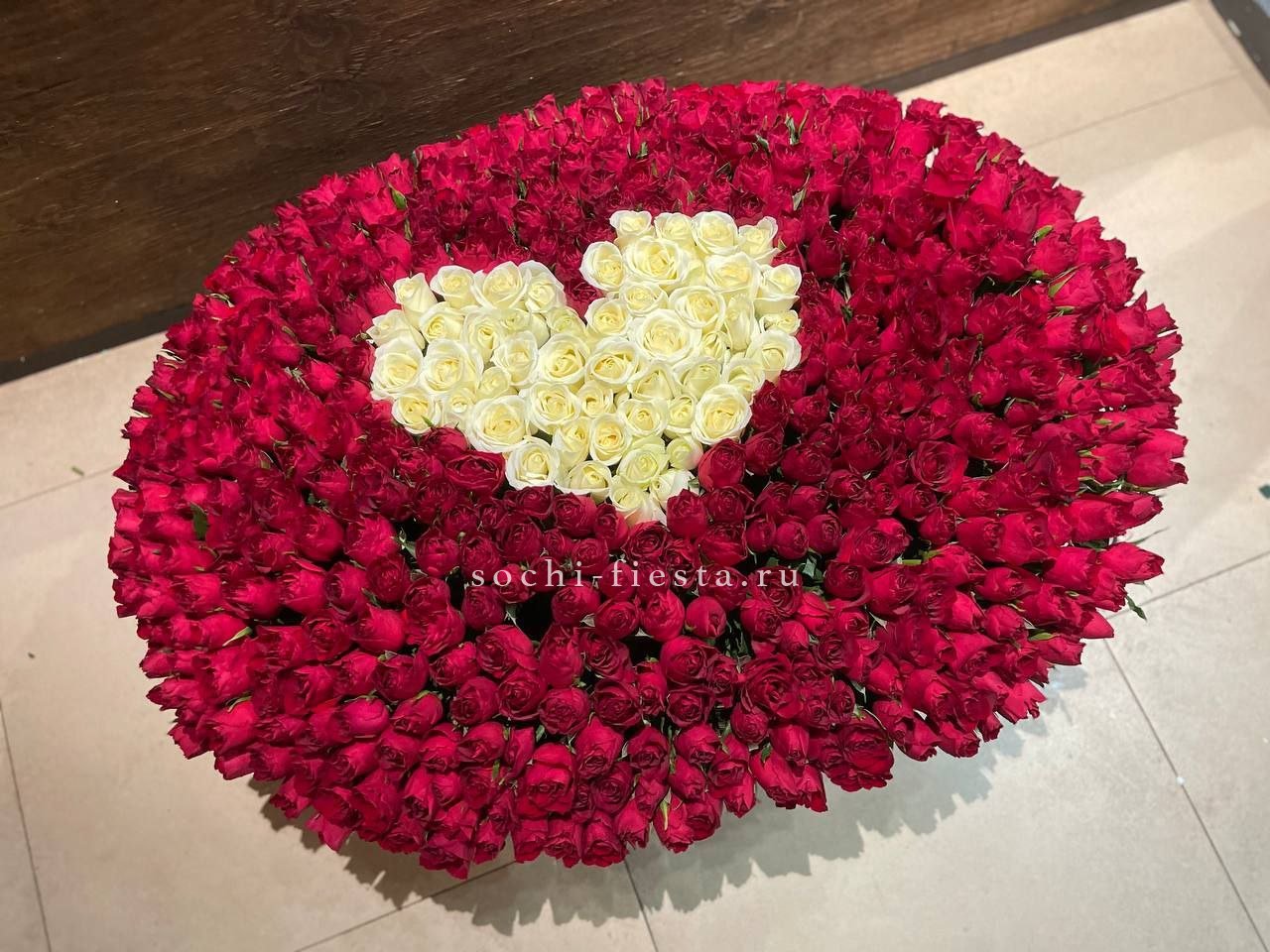 Пятьсот один бутон создает монументальную композицию в естественной корзине. Плотное заполнение формирует цельное полотно красного цвета, которое невозможно не заметить с первой секунды.