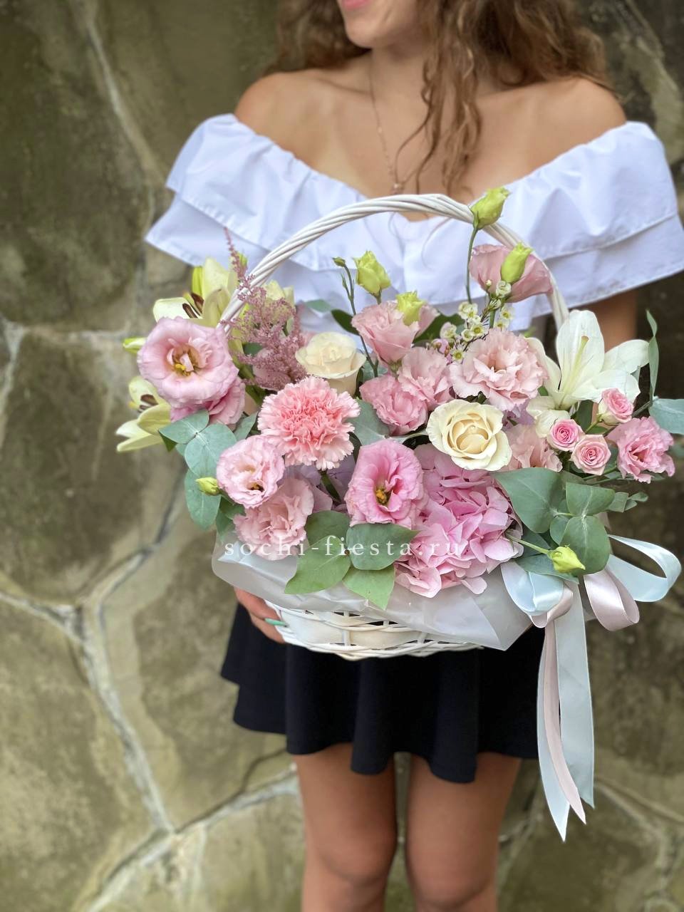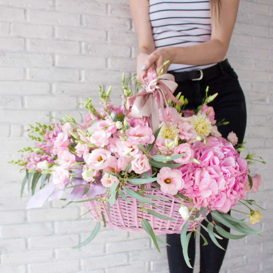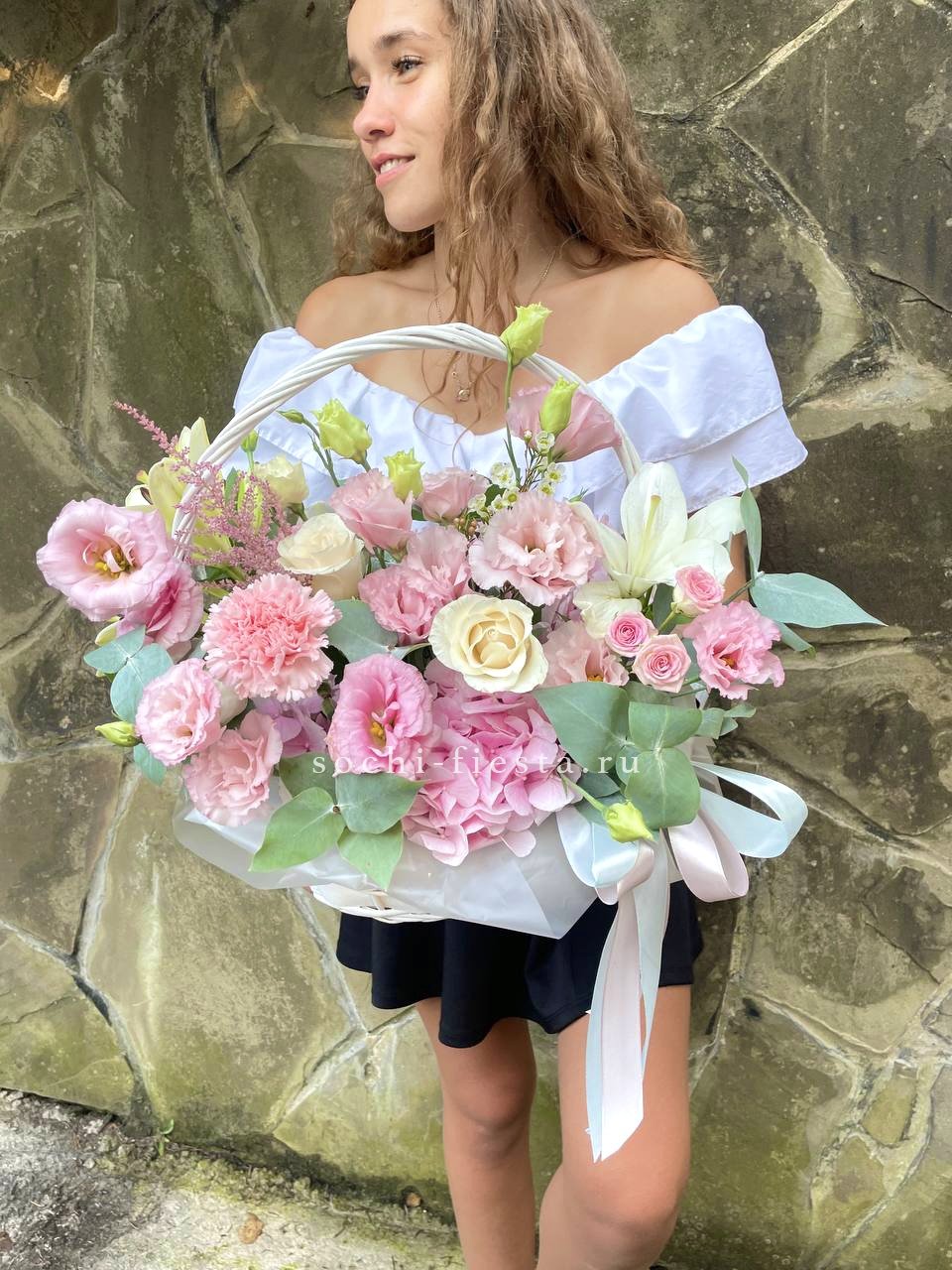 Корзина объединяет гортензии, эустомы, розы и маттиолу в многослойную композицию. Разные фактуры лепестков создают визуальную глубину и насыщенность.
