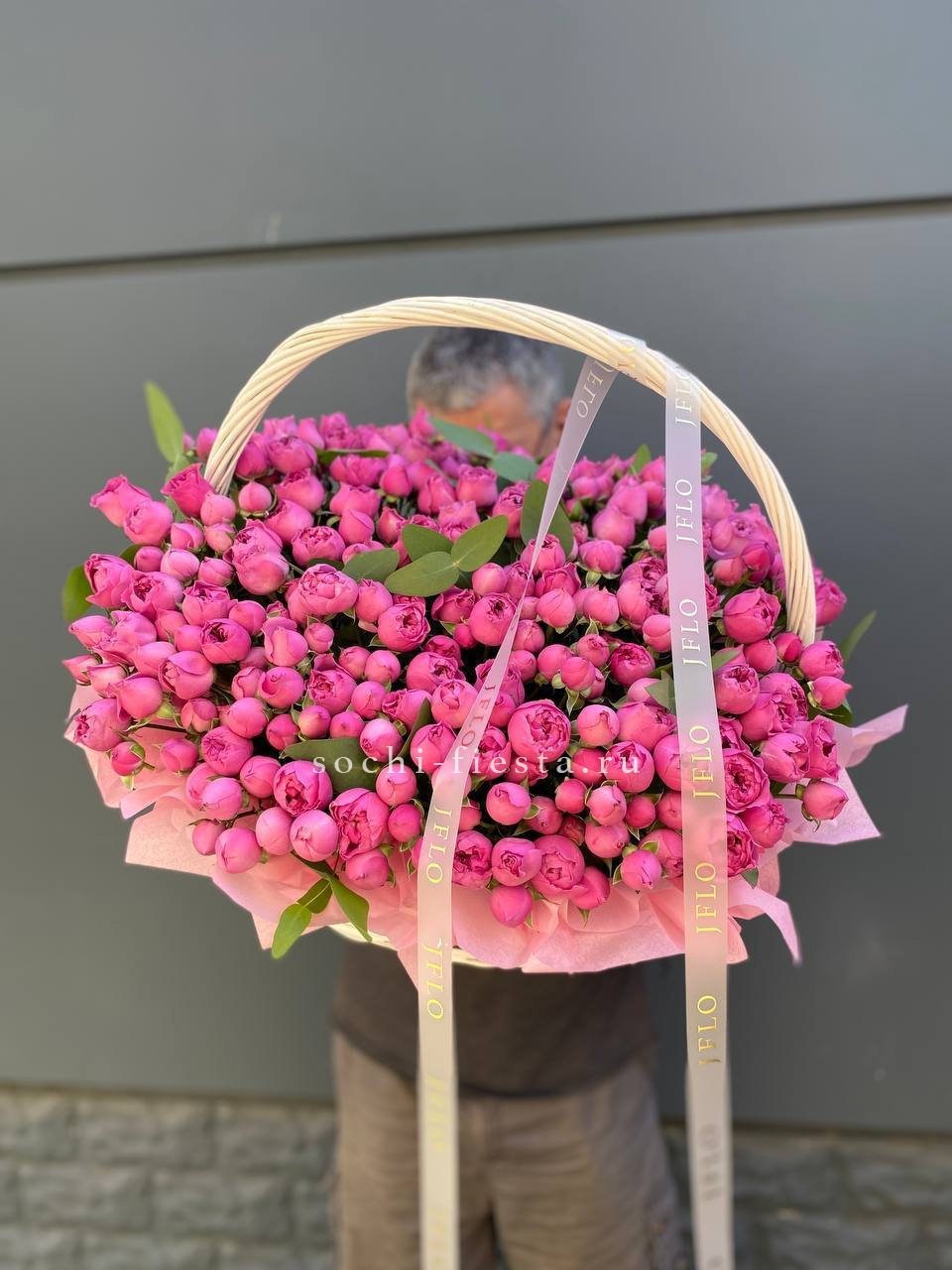 гортензия, эустома, розы, маттиола (дельфиниум или аналоги), кустовые розы, лента, корзина D40.