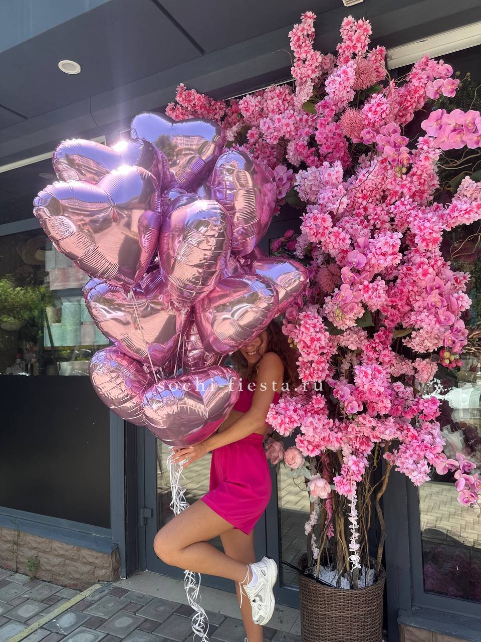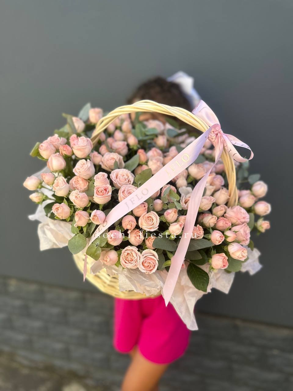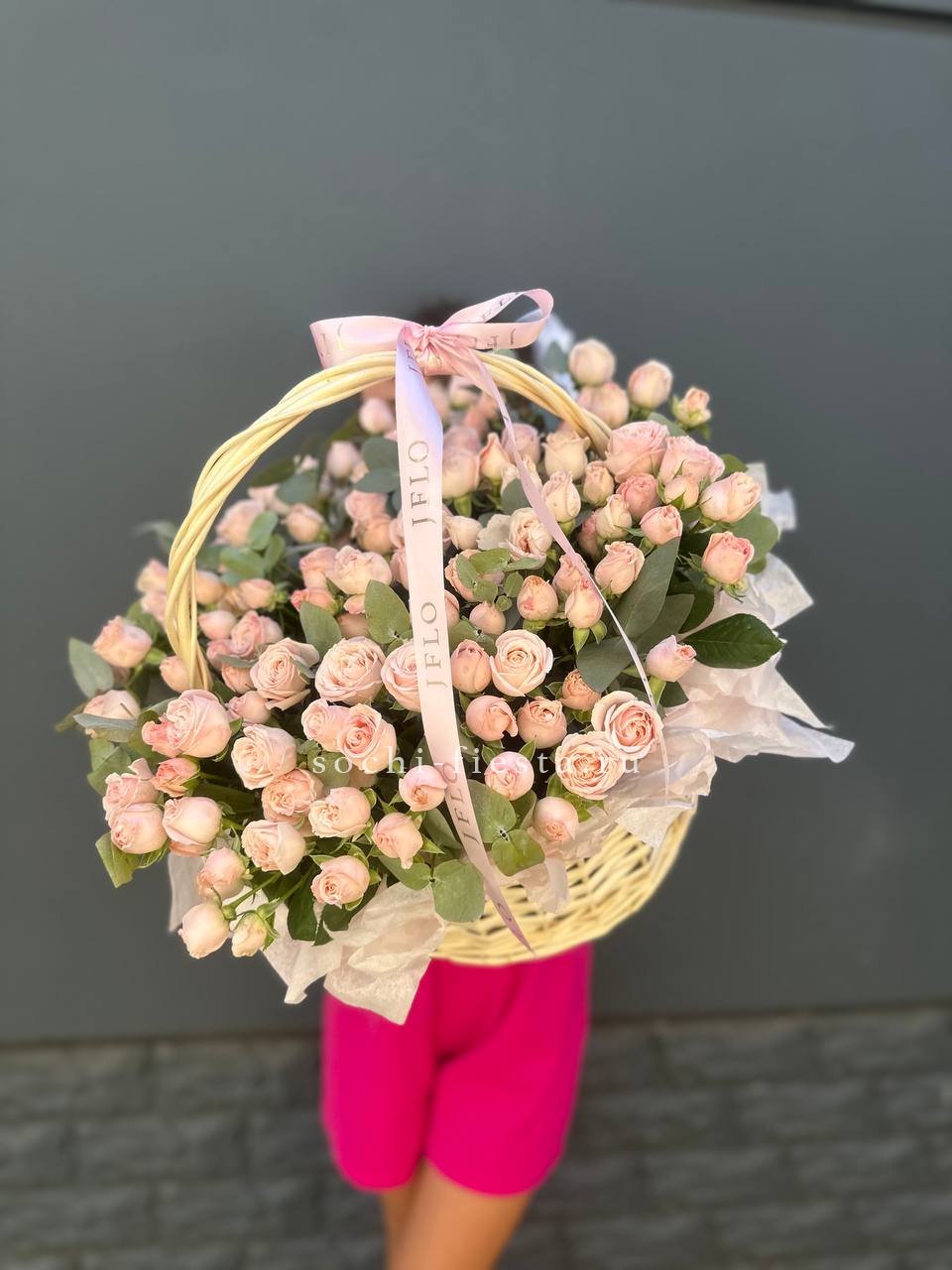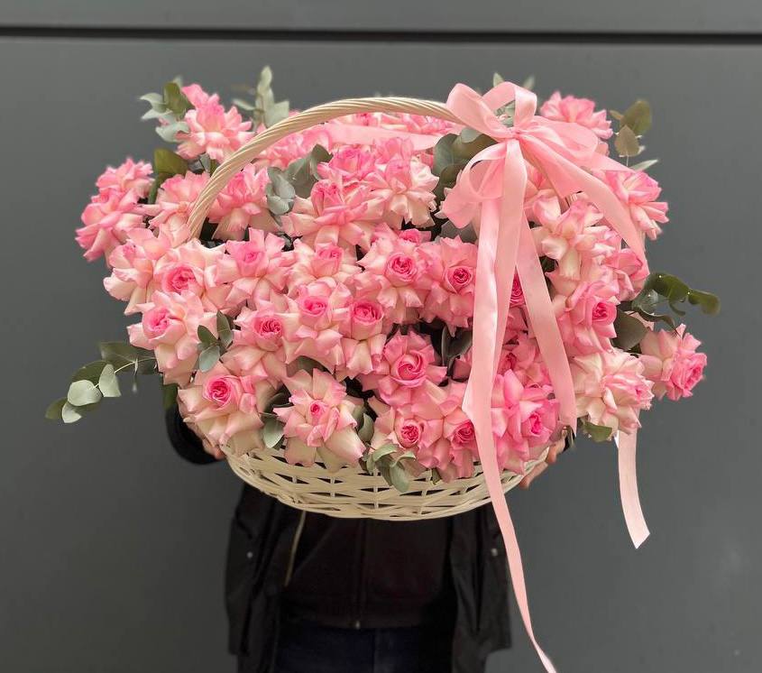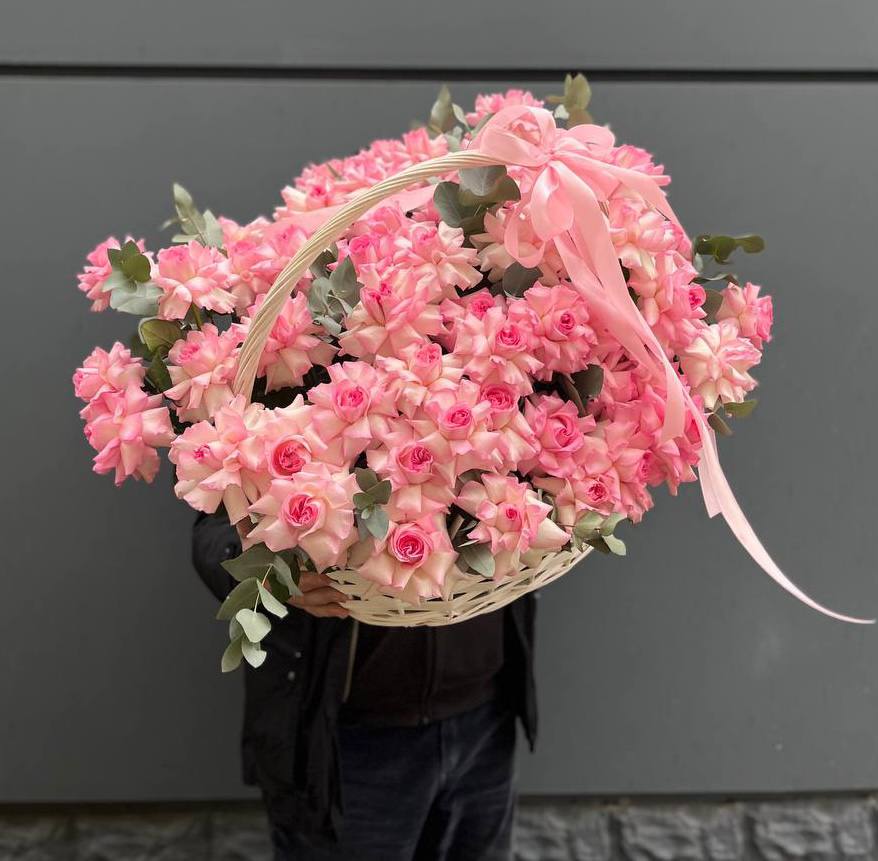 Пышная корзина с розами и гортензией раскрывается мягкими переходами розовых тонов. Эустома и диантус добавляют воздушности, а эвкалипт создает свежую основу для многослойной композиции. Авторская работа для важных событий и значимых встреч.