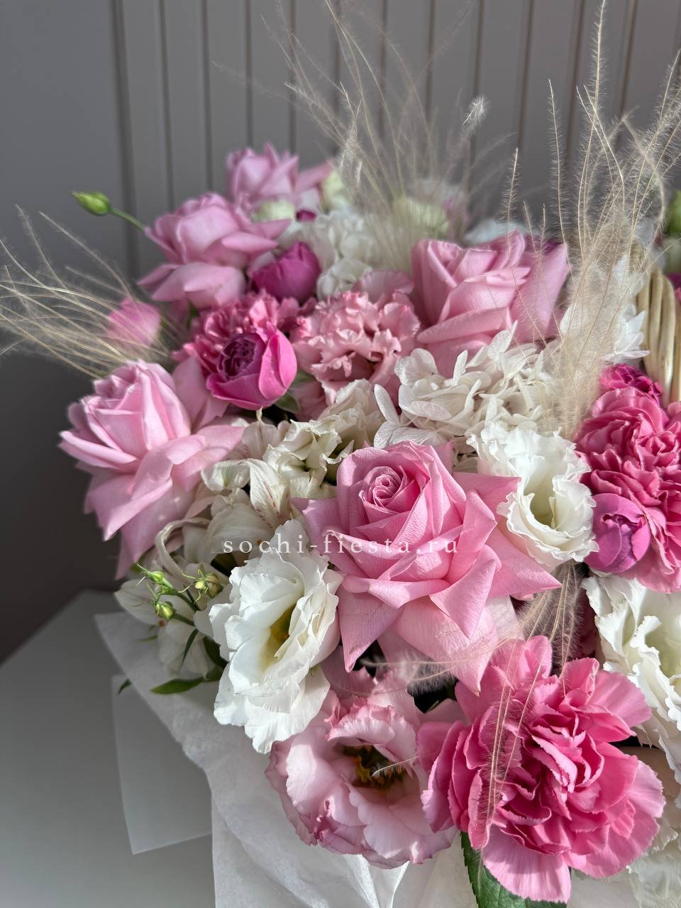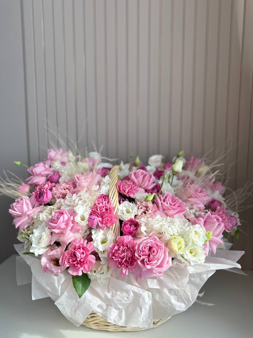маттиола, гортензии, кустовые розы, розовые розы в корзине.