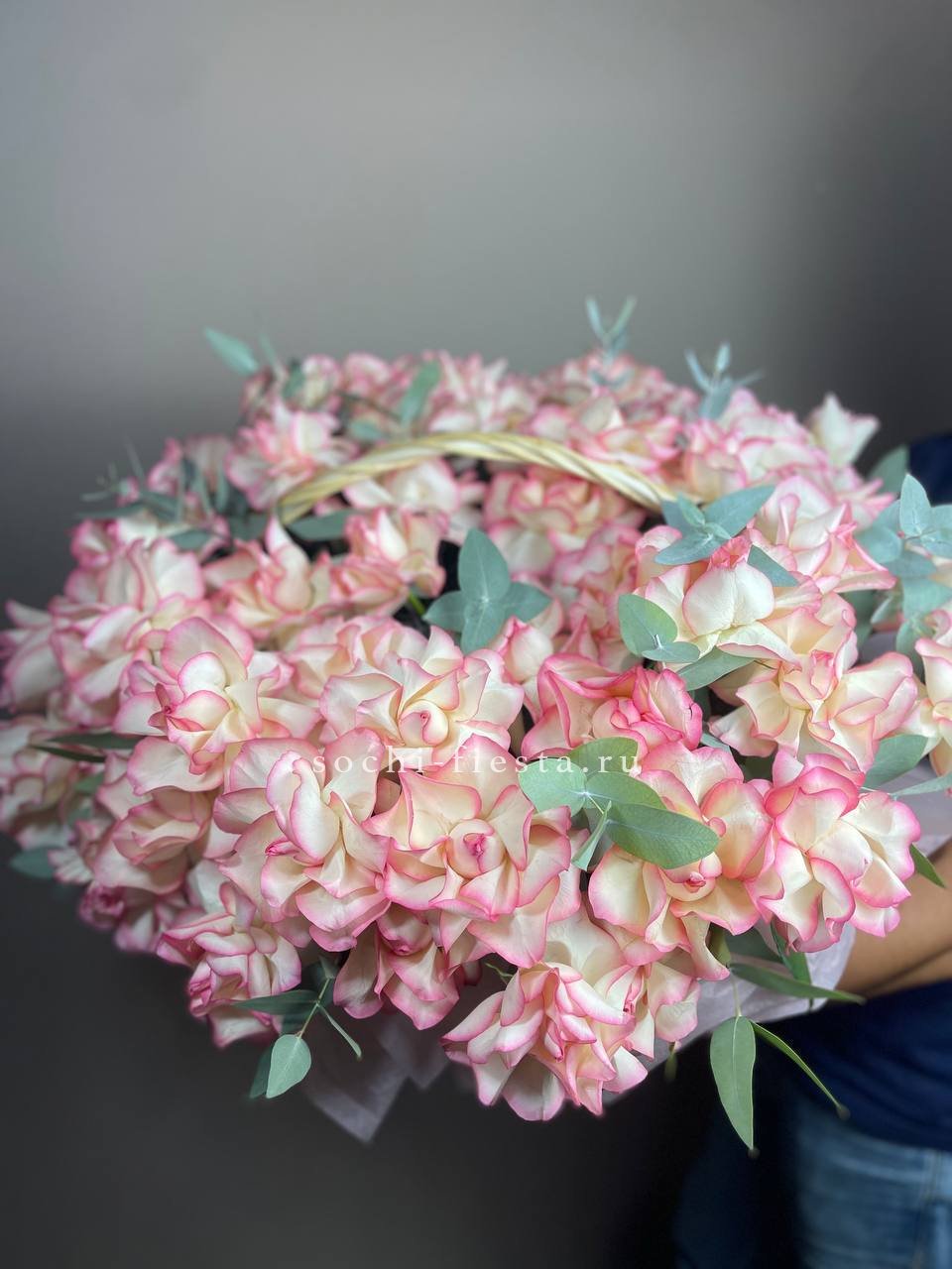 Пышная корзина с розами и гортензиями собрана плотно и объёмно. Маттиола добавляет живую текстуру между крупными соцветиями, а кустовые розы заполняют композицию мягкими переходами. Результат — впечатляющее присутствие, которое меняет восприятие пространства.
